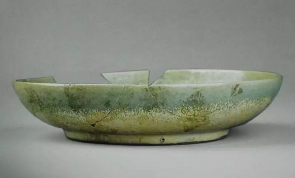 尖唇,敞口,斜弧腹,平底,圈足。釉色青绿泛灰白,釉面侵蚀较严重。垫烧。
