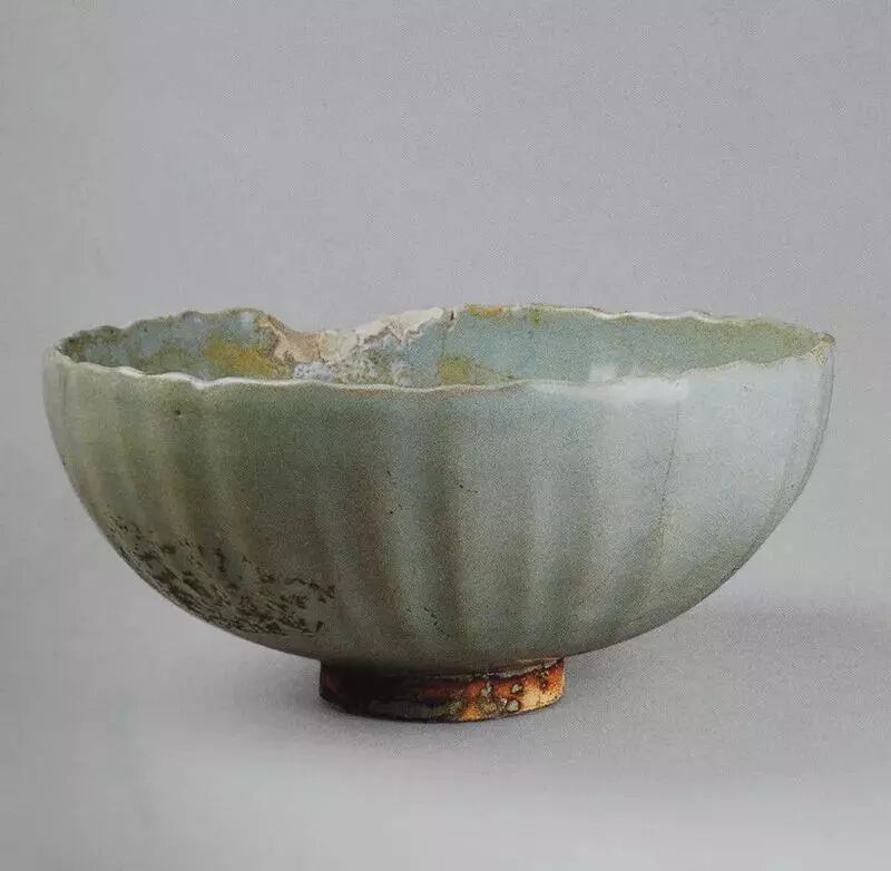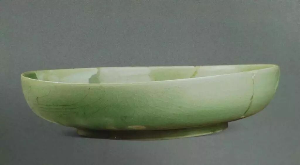花口、弧腹、小圈足。器腹呈菊线状,与花口相对应。青釉,釉面莹亮,釉面布满网格状开片。垫烧。