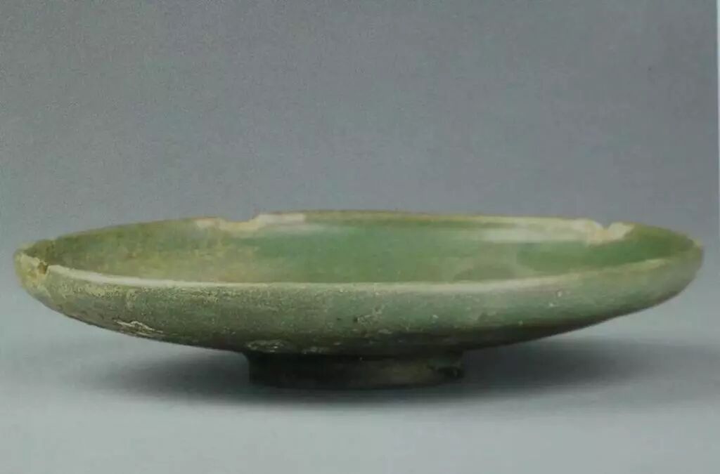 尖唇,敞口,折壁浅腹,平底,小圈足。青釉泛绿,釉面莹润。垫烧。