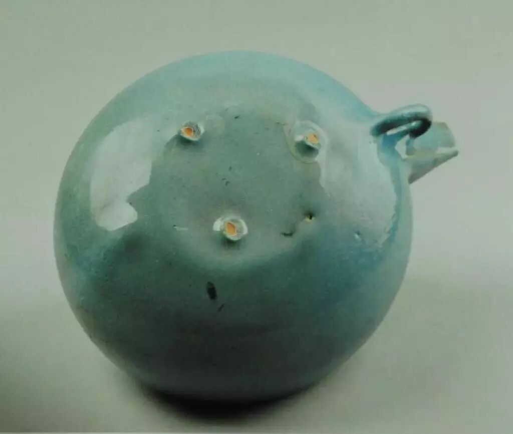 圆唇,溜肩,鼓腹,下腹向底缓收,平底,圈足。腹部一侧有流,流口微残,肩部有一对应执柄。天青色釉,釉面光亮,匀净细腻。