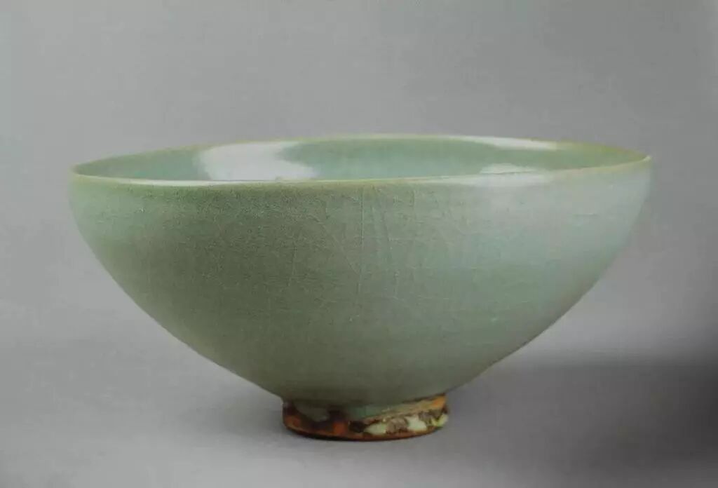 敞口,斜弧腹,小圈足。青釉泛灰,有较强的玻璃质感,通体冰裂纹开片,口沿釉薄处呈酱褐色。垫烧。