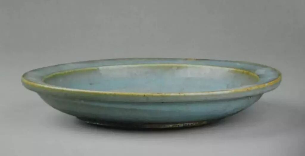 宽板沿,略内斜,外沿浅凸棱一周,矮弧腹,大平底,圈足。天青釉泛蓝,釉面光亮,匀净细腻,有冰裂纹开片,口沿釉薄处呈浅褐色。满釉支烧。同时出土的盘、碗器类,除板沿盘为满釉支烧外,其余足端无釉,皆为垫烧。