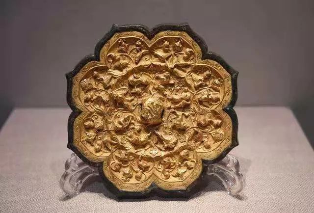 金背镜是指将金皮贴上锤鍱出浮雕式的纹样,放在预制的模子内,压印突起的花纹,再经錾刻而成背壳嵌入铜镜背面。纹饰中的瑞兽与葡萄都是舶来品,见证了辉煌丝路上的繁荣贸易。