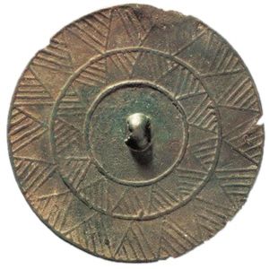 在商王武丁妻子妇好墓中也发现了铜镜,作为武丁与妇好爱情的见证,死后随之入葬。与齐家文化类似,商代铜镜镜背以几何纹居多,有七角星纹、平行线纹、叶脉纹、多圈凸弦纹等,还有素面镜。