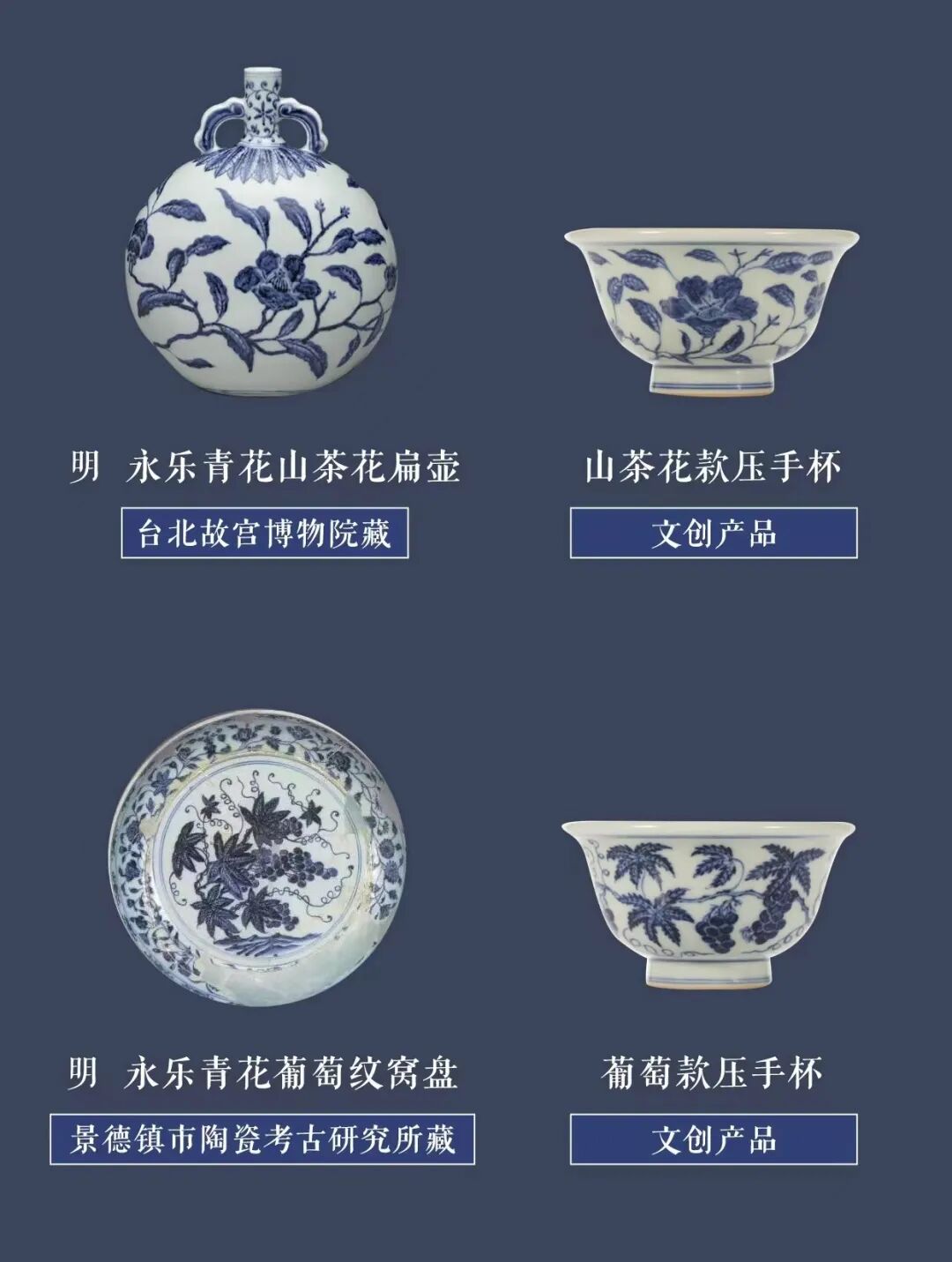 观复博物馆以台北故宫博物院藏【明永乐 青花山茶花扁壶】为蓝本,摹古烧制观复【山茶花款压手杯】,以景德镇陶瓷考古研究所藏【明永乐青花葡萄纹窝盘】摹古烧制观复【葡萄款压手杯】,竭尽所能去接近明代永乐青花本真之美。