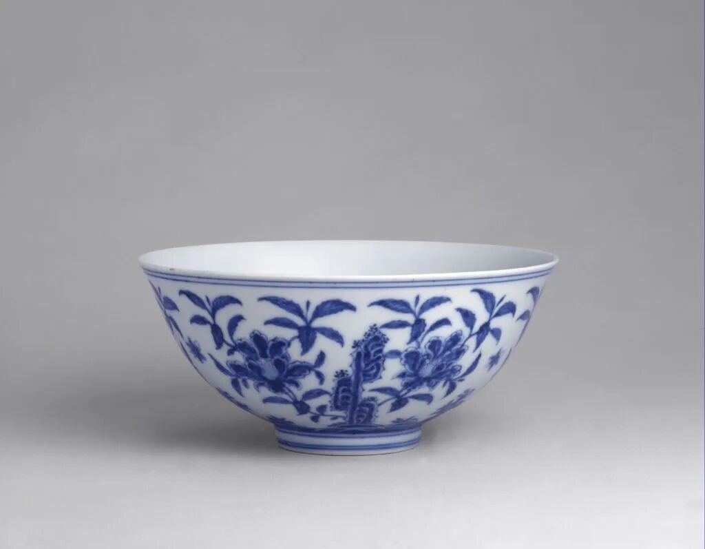 此件青花碗称得上是堪称开创了青花瓷器新的美学风范的典型“成化官窑青花瓷器”的代表作。此碗外壁青花装饰,绘三组怪石茶花纹,间以坡地花草、飞舞的蜜蜂。足内施青白色釉。外底青花双线圈内署青花楷体“大明成化年制”六字双行款。