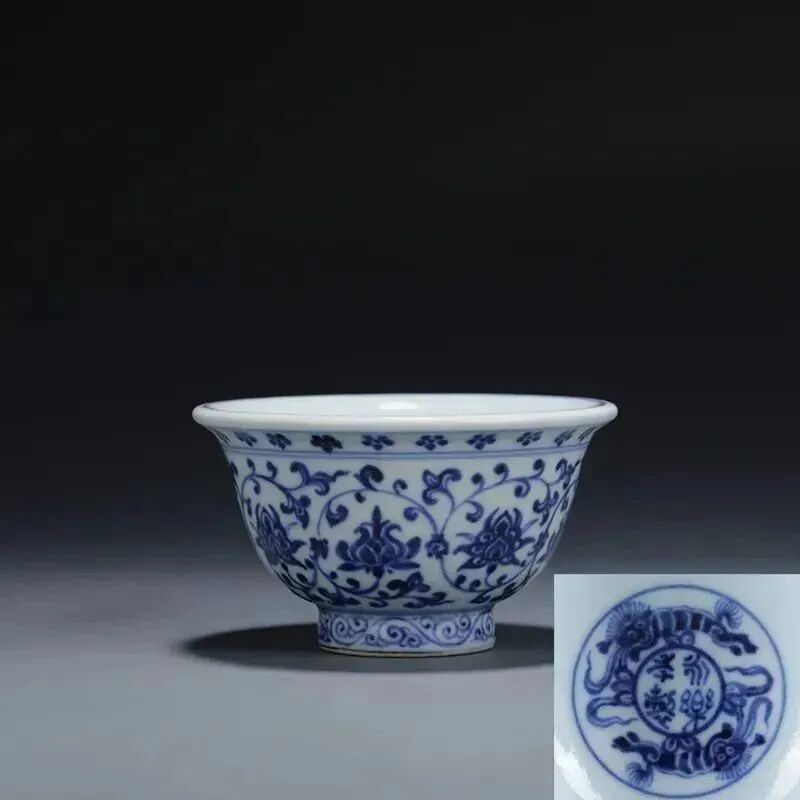 “若我永乐年造压手杯,坦口,折腰,砂足滑底。中心画有双狮滚球,球内‘大明永乐年制’六字或四字篆书,细若米粒,此为上品;鸳鸯心者次之;花心者又其次也。杯外青花深翠,式样精妙,传世可久,价亦甚高。”