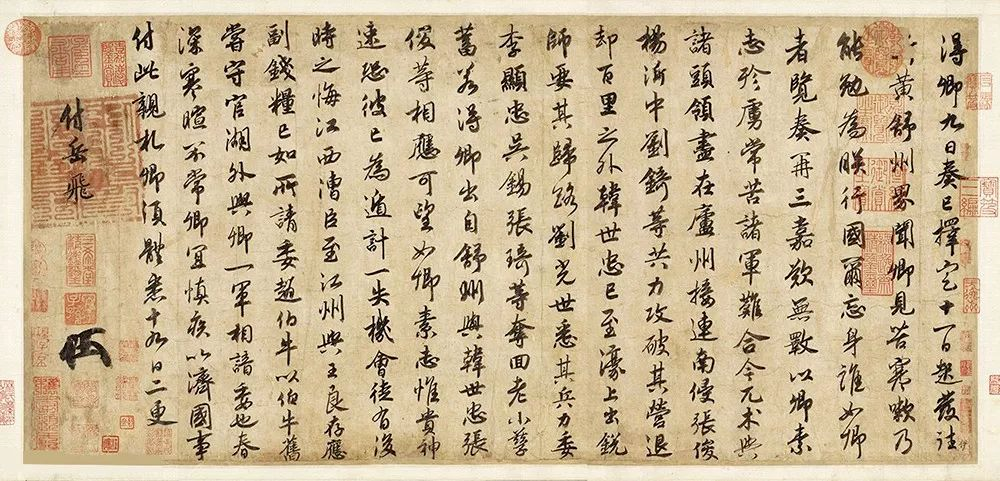 岳珂《金佗粹编》收载有76件宋高宗付岳飞的勅书,但这些勅书原件流传至今者甚少,向来被学术界及收藏界视为珍品,现存于世的主要有两件,一为宋高宗手敕岳飞的《起复诏》,为岳飞后裔世守传家之宝,1949年后流落海外,前不久亮相西冷秋季拍卖会的《起复诏》以830万元成交,可见人们之珍爱程度,另一件为宋高宗《付岳飞勅书和批答》,均有极高的史学、书法史价值。朱家溍《宋高宗付岳飞勅书和批答》考证了此件勅书,系赵构手敕慰劳岳飞驻军江州加强秋防的原件,作于绍兴十一年三月十九日[35]。一般认为,《起复诏》为绍兴六年岳飞在庐山为母守丧期间高宗下达给岳飞结束丁忧的手敕,但虞云国《宋高宗手敕岳飞〈起复诏〉的始末与真伪》[36]对西冷秋季拍卖会上的《起复诏》提出几点质疑,首先《起复诏》落款所署时间与南宋李心传《建炎以来系年要录》所载有抵牾,二是《起复诏》中高宗自称“皇帝书赐岳飞”,明显有违宋代皇帝赐臣下书信的用语习惯,《金佗粹编》收载有76件宋高宗付岳飞的“宸翰”无一件有此自称,大多为“付岳飞”字样;第三,这件亲笔诏落款后没有“御押”押字,更是违背高宗行文的惯例,因此这件《起复诏》拍卖品系后人伪造可能性很大。虽然作者仅仅提出了质疑,但所指出的三个疑点无疑值得重视。