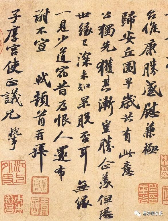 岳飞的书法学苏轼,字体横划取斜势,即“东坡体”。此三篇为行书,字字墨酣笔畅,朴茂无华,并无赝品中剑拔弩张的那种戾气。是一件非常珍贵的书法佳作,这才是岳飞书法的真实面貌。