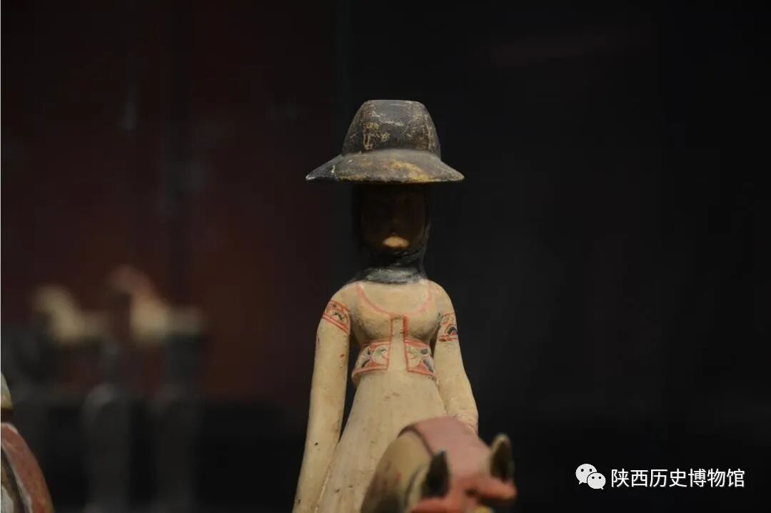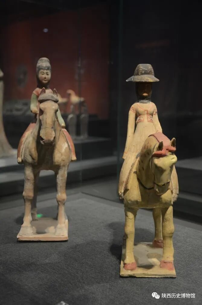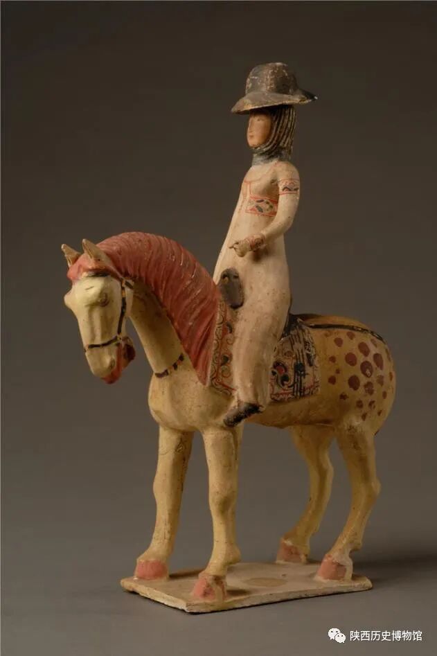这件出土于唐郑仁泰墓的女骑俑,圆脸、阔眉朱唇、头戴笠帽,乳白色襦衫外套带花边的黄色半袖,下着淡黄色条纹长裙,足穿尖头鞋,骑在一匹红斑纹黄马上,勒缰前视,神情悠然,高贵文雅,是初唐仕女出行的真实写照。