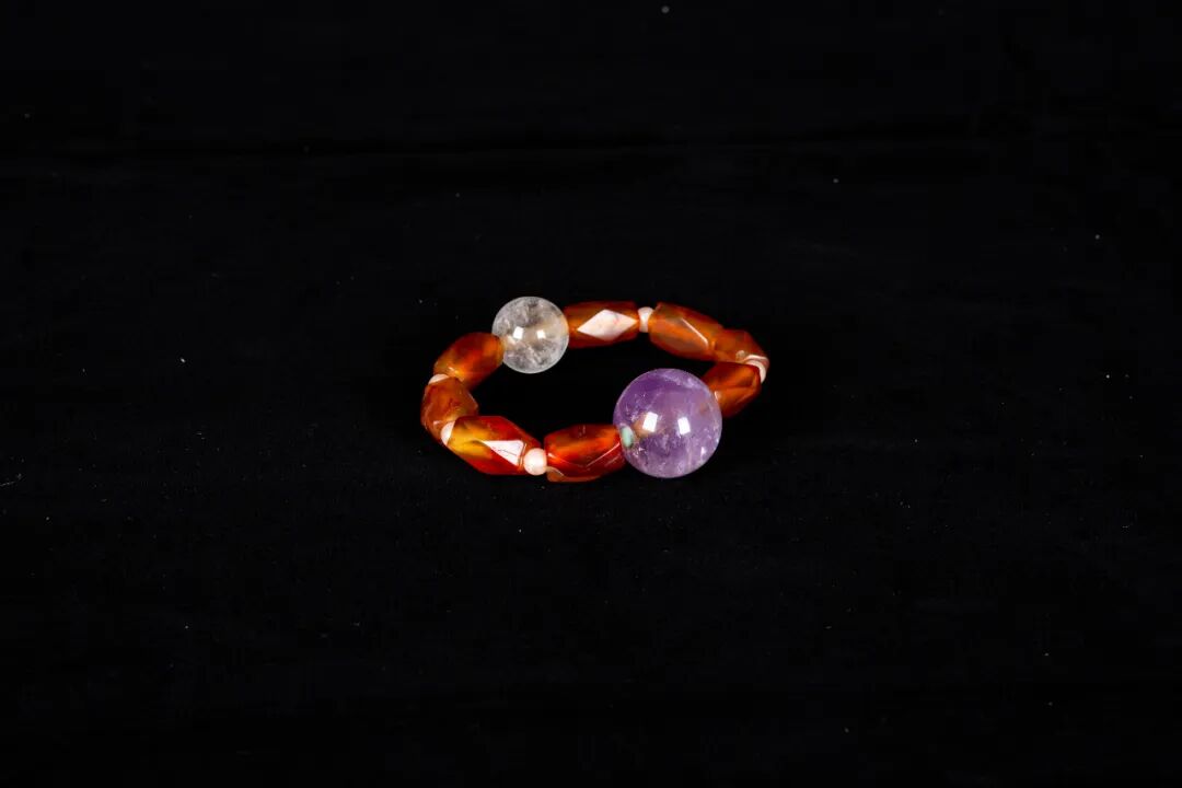 珠串简约而不简单,只紫色、白色与红色,整体明亮通透。从颜色上,冷色调的紫水晶与白水晶在切割齐整的红玛瑙珠的配搭下更显清冽。此珠串适合庄重沉稳的女性,搭配藏蓝等深色衣物为佳,以其不争不辩敛其锋芒,于内通透,敞亮自在,更显自如。
