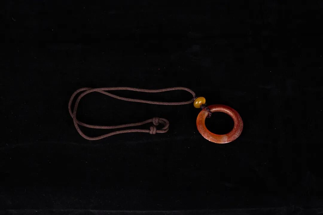 此件仿古玛瑙环厚重温润,妖而不艳,非常符合传统美玉的审美条件,用同色系绳子再点缀一颗鸡黄色的珠子,更显大气,适合在秋冬时分,搭配纯色衣物,彰显女人味。