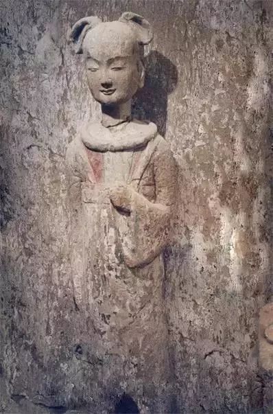 关于这位女童,据记载是受佛祖指派去问候维摩诘病情的一位女童子,她那异常生动的塑造,自然生动纯真的微笑极具感染力,眯细的眼睛和收敛的目光,夸张的领口弧线对微笑的动势起到明确的强调作用。