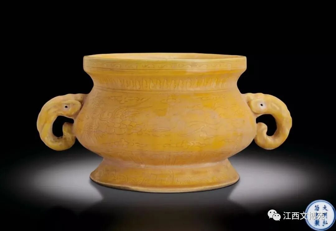 明弘治 黄釉象耳刻花香炉