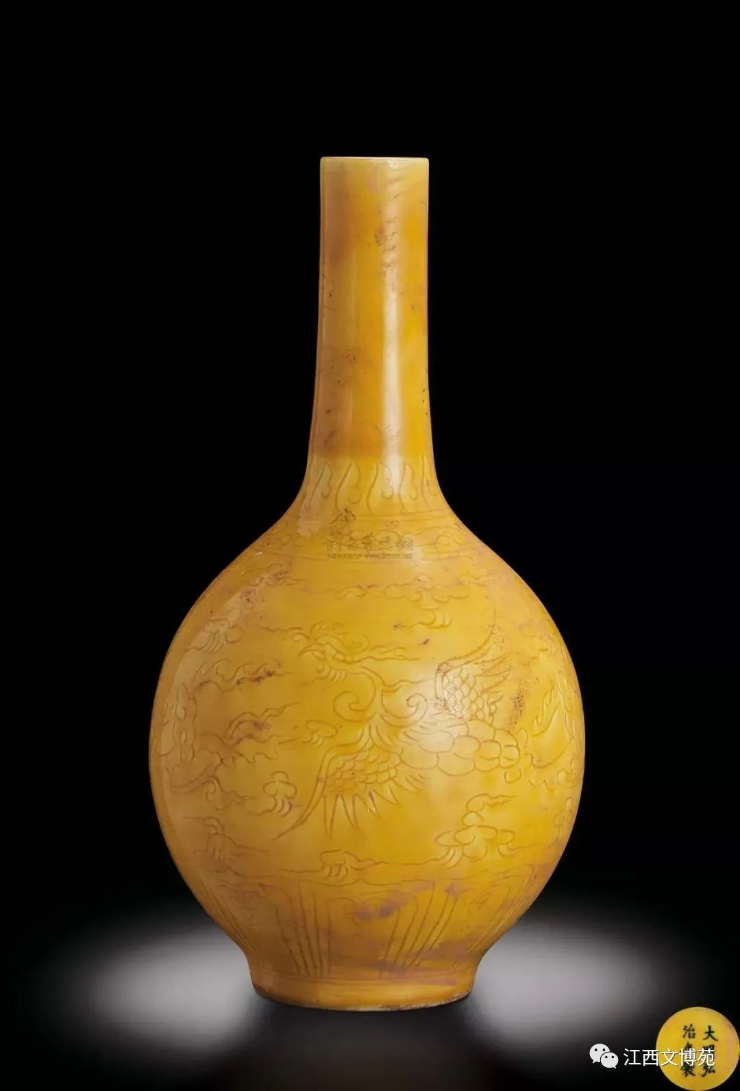 明弘治 黄釉刻花凤纹长颈瓶