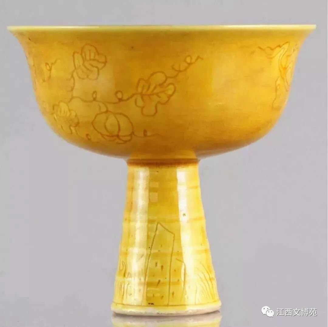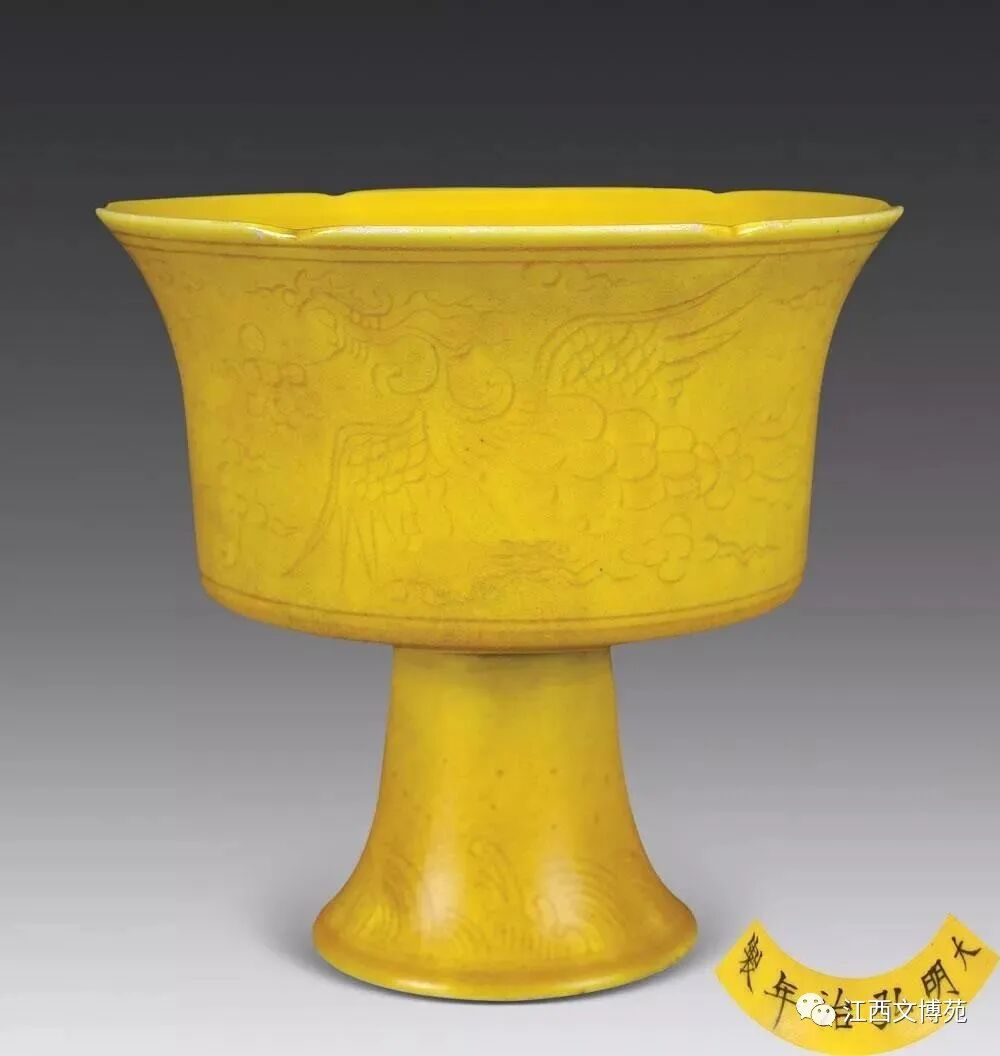 明弘治 黄釉刻云凤纹高足碗