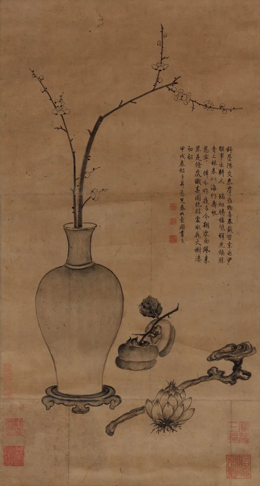 此轴描绘瓶梅、双柿、如意、百合等物。以“梅”寓意先春报喜,用“瓶”与“百合”表达平安祥和,托“双柿”和“如意”寄意事事如意。“百合”、“柿子”、“如意”组合亦有“百事如意”之意。