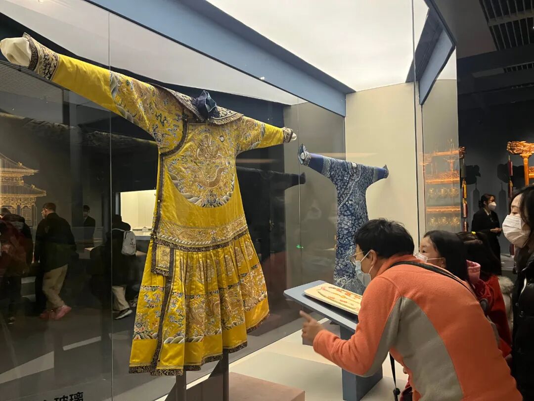 观众在明黄色缎绣彩云金龙纹男夹朝袍展柜前驻足