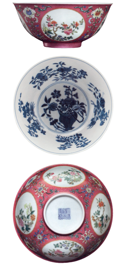 在世界各地博物馆中零散收藏着这样一类乾隆、嘉庆、道光六字篆书款的内青花外色地轧道开光粉彩碗,常见题材有“三羊开泰”“五谷丰登”“牛郎织女”等,特征鲜明,纹饰多样,制作精良,俨然自成系列。在西方收藏家心目中,这类膳碗被认为“是道光时期最好的官窑的制品”,并有“圆章碗”的专门称谓。