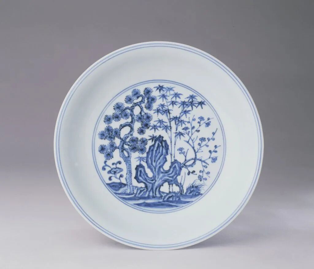 青花松竹梅纹盘,明宣德,高4.2厘米,口径21.4厘米,足径13.6厘米。盘撇口,弧壁,圈足。内外皆有青花纹饰。盘心环以青花双圈,内绘松、竹、梅、山石、灵芝等纹饰。外壁绘庭园景色,远方仙山云气缥缈,近有悠闲的贵妇等人物凭栏而立,以山水、杨柳等景物相衬。口沿和足边各饰青花弦纹两道。圈足内施白釉,中间青花双圈内书“大明宣德年制”双行六字楷书款。