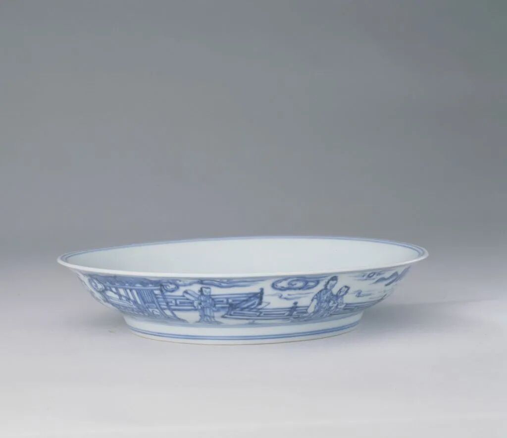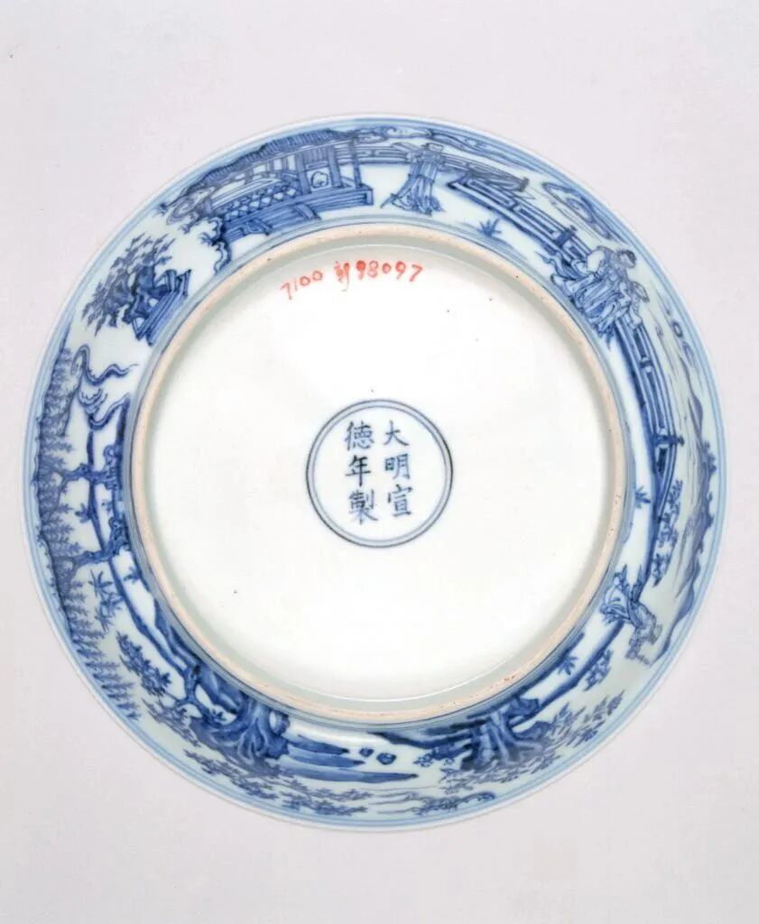 宣德青花瓷器造型敦厚端庄,釉面青亮,纹饰细腻豪放,笔法潇洒,一向被列为明代青花之冠。此盘主题纹饰为松竹梅纹。松竹梅世称“岁寒三友” ,寓意高风亮节。外壁绘画的庭园仕女图为研究明代贵族妇女的生活提供了宝贵的资料。由于宣德时期青花原料数量较少,因此在青花器上绘制人物图案者为数不多,此器则更显珍贵。
