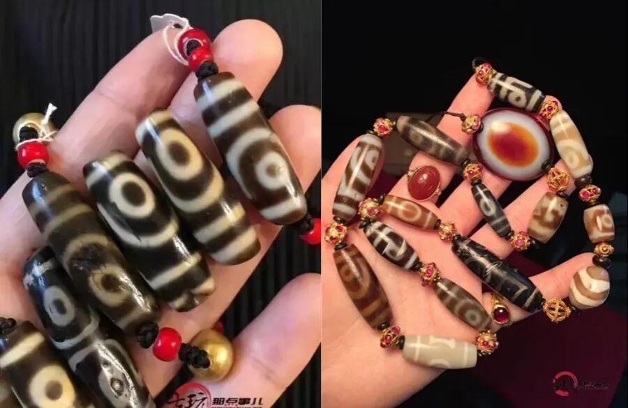 头上戴的巴珠、簪子、发卡,发辫的银币,耳朵上的大环,项间戴的项链、托架、嘎乌,腰上系的图纹腰带,悬挂的火镰盒子、藏刀、腰扣、鼻烟壶,手上戴的各类戒指手镯等。天珠是西藏非常独特的饰物,当然现在已经从西藏传入中土,成为了文玩圈炙手可热的配饰之一。不同的纹路则对应了不同的图腾并具体代表了不同的象征。