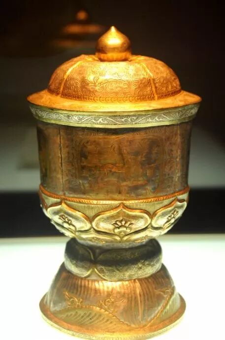 钣金成型,纹饰鎏金。带盖,直口,深腹,圈足。盖钮为宝珠形。盖面隆起,分为四瓣,每瓣内模冲出一只飞狮,细部施以錾刻,底部衬以缠枝蔓草,每瓣凹棱侧饰“旷状二方连续纹样。坛盖与身以子母口扣合。腹壁划分为4个壶门规范,其中分别錾仙人对弈、伯牙捧琴、箫史吹箫、金蛇吐珠等人物画。高247毫米,径132毫米,腹深112毫米,圈足径126毫米。总重883.5克。