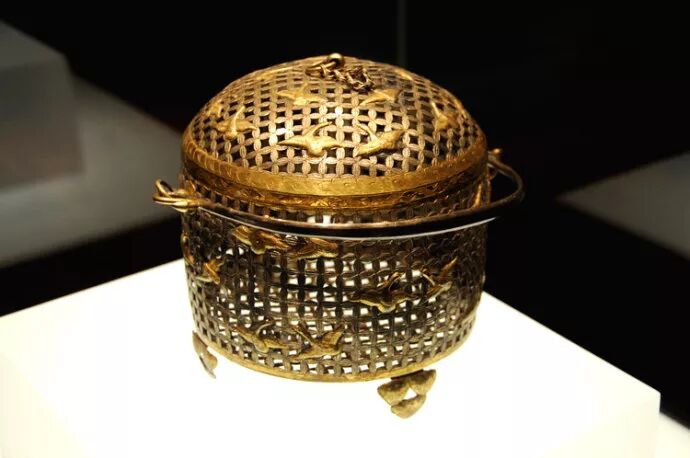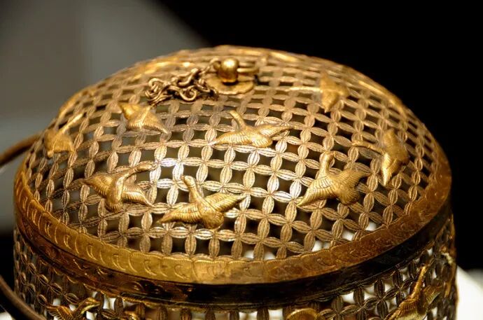 法门寺地宫所藏这套茶具有碾茶用的鎏金壸门座茶碾子、取茶用的鎏金飞鸿纹银匙、储放茶叶用的鎏金银龟、生火煮茶用的壸门高圈足座银风炉、饮茶用的素面淡黄色琉璃茶盏和茶托,以及茶笼、茶罗、茶盆、调料盛器等,包括了从茶叶的贮存、烘烤、碾磨、罗筛、烹煮到饮用全部过程所用器具。其中属贮茶器类的金银丝结条笼子,以金丝和银丝编结而成,制作精巧细腻,玲珑剔透,是唐代金银工艺中绝无仅有的精品,代表了晚唐时期金银器制作工艺的最高水平。