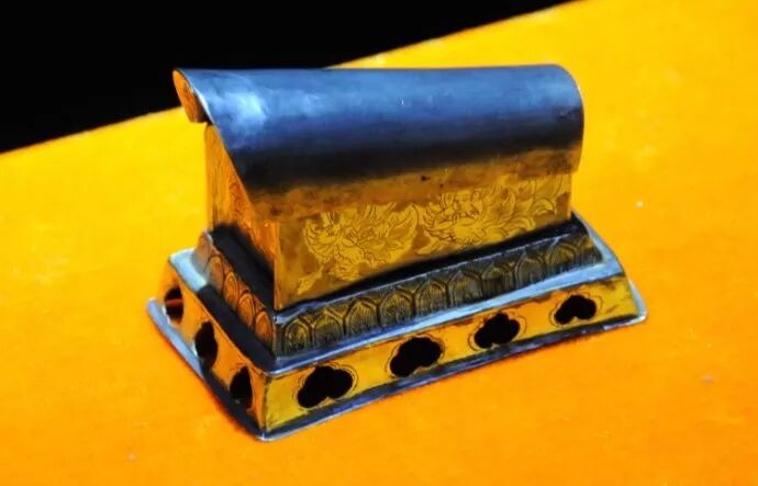 器形为长方体,由盖、罗、屉、罗架、器座组成,均为钣金成型,纹饰涂金。盈顶盖面錾两体首尾相对的飞天,头顶及身侧衬以流云。盖刹四侧各饰一和合云,两侧还饰如意云头。刹边饰莲瓣纹,盖立沿饰流云纹,罗架两侧饰头束髻、着褒衣的执幡驾鹤仙人,另两侧錾相对飞翔的仙鹤,四周饰莲瓣纹。罗、屉均作匣形。分内外两层,中夹罗网。屉面饰流云纹,有环状拉手。罗架下焊台形器座,有镂空的桃形壶门。高95毫米,身长134毫米,宽84毫米。屉长127毫米,宽75毫米,高20毫米。座长149毫米,高20毫米。重1472克。
