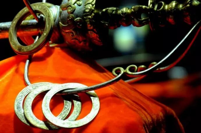 杖头为双轮四股十二环,四股以银条盘曲而成,每股套装雕花金环3枚,股侧铭刻:“文思院准咸通十四年(873)三月二十三日敕令造迎真身银金花十二环锡杖一枚,并金共重六十两,内金重二两,五十八两银,打造匠臣安淑郧,判官赐紫金鱼袋臣王全护,副使小供奉官臣虔诣,使左监门卫将军弘悫”。四股顶部有两重束腰莲座,上承一枚智慧宝珠。下部饰忍冬花、流云纹,并自上而下精细錾刻身披袈裟、手持铃铎、立于莲台之上,有头光的12位圆觉菩萨。这枚锡杖是佛教世界的权威,属佛祖释迦牟尼,是世界锡杖之王。