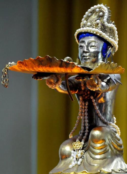 此尊捧真身菩萨是唐懿宗三十九岁生日时为供养佛指舍利而敬造的。咸通十四年(八七三)在迎送佛舍利时,与佛祖之金骨真身一并请入地宫永为供养。捧真身菩萨双手捧着放置刻有发愿文的鎏金银匾荷叶盘,愿文为:「奉为睿文英武明德至仁大圣广孝皇帝,敬造捧真身菩萨,永为供养。伏愿圣寿万春,圣枝万叶,八荒来服,四海无波。咸通十二年辛卯岁十一月十四日皇帝延庆日记」。捧真身菩萨造像取法于吉祥天女的造型,莲台束腰錾刻四大天王,不但契合「发愿文」中「八荒来服,四海无波」的镇护国家思想,也与捧真身菩萨「永为供养」的法义相应。此尊之表法:一为供养,二为护国,三为忏罪消灾,四为增福延寿。这是第一尊在地宫出现作为供养品的佛菩萨像。