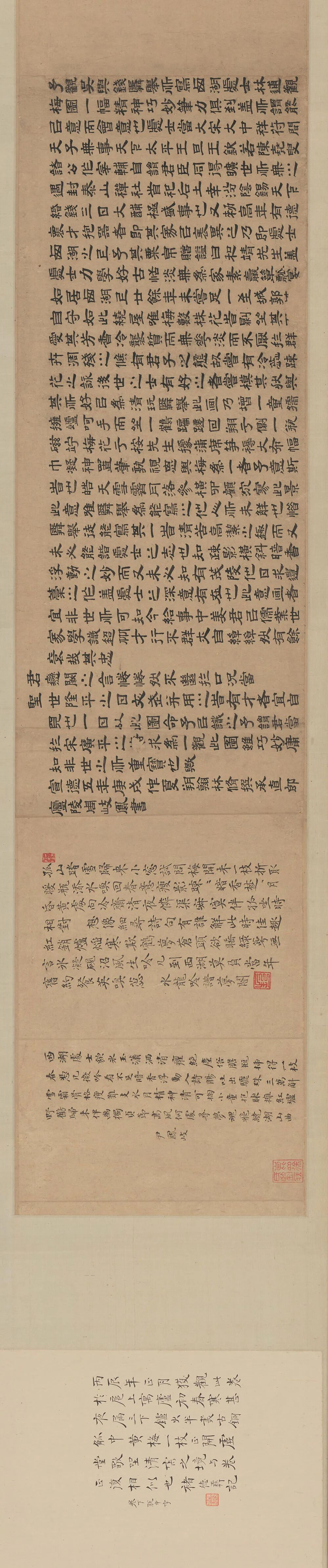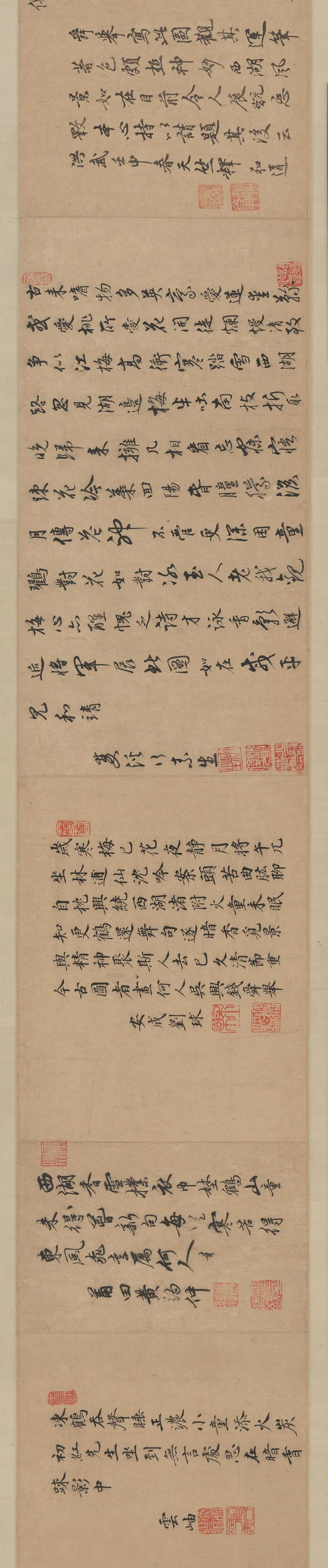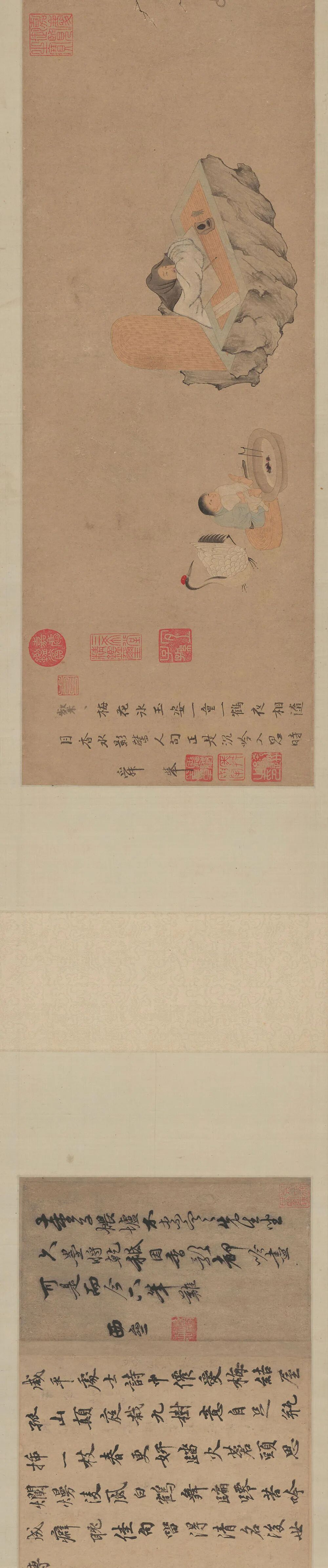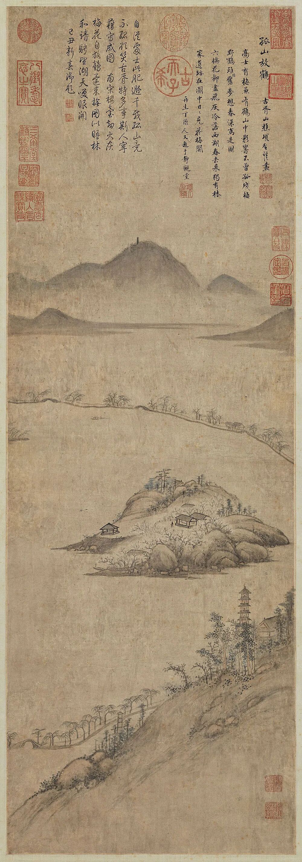 林和靖自己入了画,梅妻鹤子也入了画,甚至连同和靖先生的诗文也转化成了画。南宋时代的马远、马麟父子还能将林和靖的整体形象呈现,至明代和靖先生、梅妻鹤子的具象化形态已经不再重要。而托名钱选的《西湖吟趣图》于是就成为和靖先生形象化描绘中不可多得的重要画作。