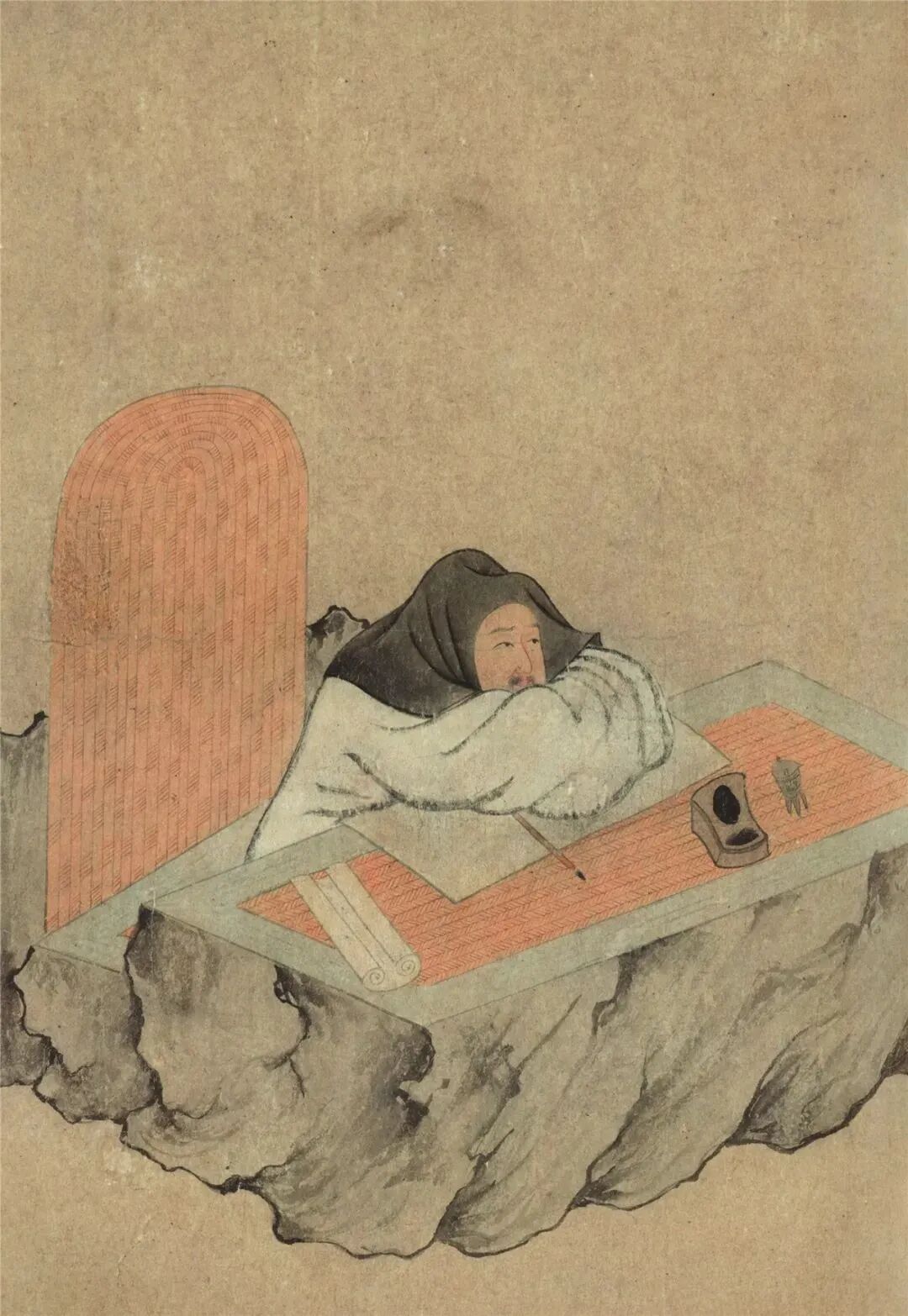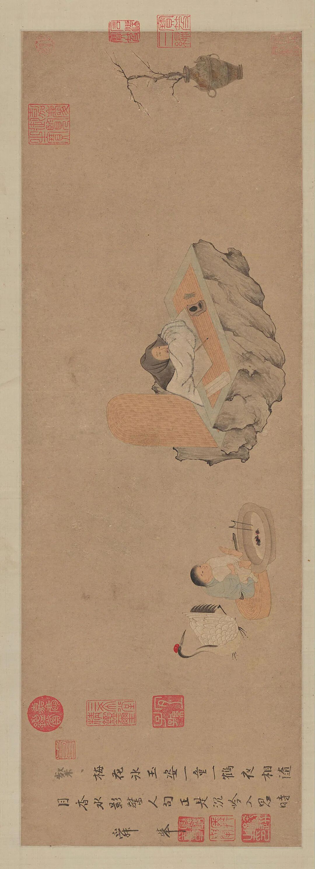 世人若想一睹和靖先生风采,藏于故宫博物院的《西湖吟趣图》则是最佳之选。托名钱选(约公元1239—1299年)的《西湖吟趣图》上,林和靖在画心正中,伏于案上,神情专注地凝视着前方的瓶中梅枝,林和靖后面的小侍童手脚均置于炭盆上方取暖,其后的仙鹤望向和靖先生。孤山冬天清冷的寒意尽显于画面,但是一心隐逸的和靖先生显得雅逸平和,烤火取暖的小侍童与回首卧鹤之间产生的意趣,也跃然纸面,只有一株白梅孤傲地置于画幅前端。画面上的和靖先生眉目清晰,神情中显现出一丝喜不自胜的会心微笑,炭盆前的小侍童望着和靖先生的背影,对于先生“赏梅放鹤”有多少疑惑。和靖先生的案上,笔墨纸砚与酒樽俱全,和靖先生可赏梅吟诗,亦可伏案作画。黄庭坚(公元1045—1105年)曾言:“和靖字画尤工,笔意殊类李西台,而清劲处尤妙。”