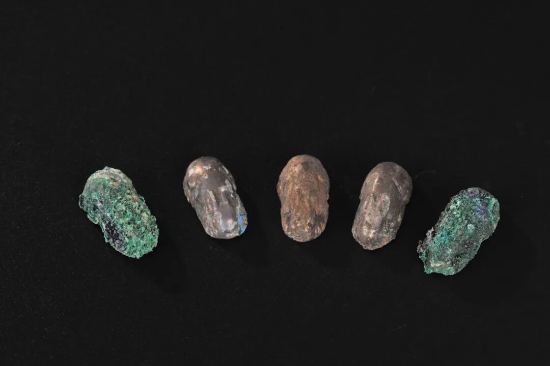 南越王墓出土的珍珠主要分布在三个地方。在南越王赵眜棺椁的头箱中,有一个装满了珍珠的大漆盒,重达4117克;另外,在南越王赵眜的玉衣头套下面,发现原有一软枕,全以珍珠填充,约有470克;此外,考古工作者在清理南越王赵眜的下颔时,发现有百余粒珍珠,珠体直径约4毫米,部分珍珠还粘有丝织物残痕,推测是南越王入殓时用丝绢包裹成一个珍珠团塞入口中。珍珠作为“口含”和“枕芯”,亦是南越王“珠玉敛葬”的重要组成部分。此次“海宇攸同——广州秦汉考古成果展”全面展示了南越王的丝缕玉衣、玉璧、玉觹、双联璧、珍珠等物,可以说是历次外展展示南越王“珠玉敛葬”最完整的一次。