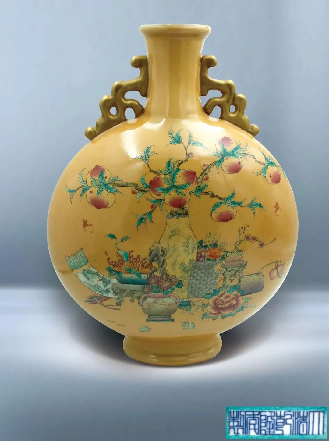 250 清 黃釉彩清供紋雙耳抱月瓶
