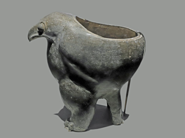 鹰眼圆睁,喙部有力呈钩状,结构简洁,威武雄壮,鼎口设置于背部与两翼之间,紧密结合似背抱状,将鼎形器物特征与鹰的动物美感巧妙地融为一体。