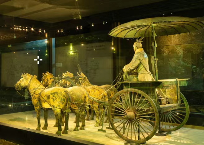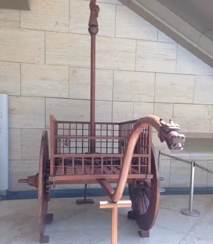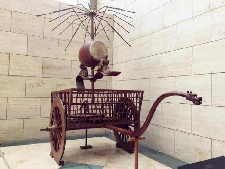 然而此时的马车在功能和形制上的发展并没有停滞,六朝时期出现了司南车和记里鼓车,《晋书·舆服志》载:“司南车,一名指南车,驾四马,其下制如楼,三级;四角金龙衔羽葆;刻木为仙人,衣羽衣,立车上,车虽回运而手常南指。大驾出行,为先启之乘。记里鼓车,驾四,形制如司南,其中有木人执棰向鼓,行一里则打一棰。”通俗来说,司南车就是指南车,出行时一般行走在最前方,为整个车队指引方向,记里鼓车则用来记录车辆行过的距离,这些都体现出了六朝人的智慧。
