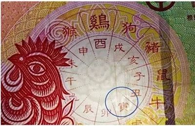 正面中间圆形胶印底纹中,白色线条勾勒出的莲花图案的固定水印,会出现在每一年的生肖贺岁纪念钞表面,唯一变化的是罗盘上每一种生肖年号在慢慢的轮转。