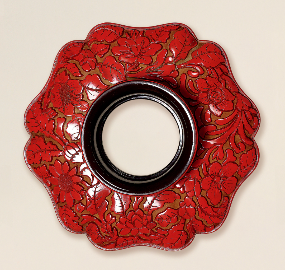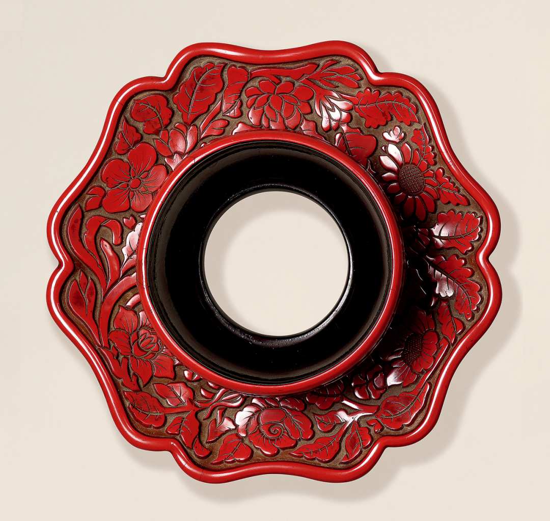 此盏唇口微侈,口沿包镶金属扣,外壁口沿下一圈微束,便于持取,精到考究,乃美观与实用并举之作。内底平,圈足,足心浅挖,足际稍宽,修足规整。里外满施黑釉,外壁釉不及底。接近底足处积釉,形成垂珠,绀黑黝黝,宝光外露。釉面析出兔毫纹,丝丝绵长,边廓清晰,条达有力,沁人心脾。底部露胎处,可见铁褐色胎土,厚实稳扎。下配朱漆花形盏托,盏托由圆形盏、葵瓣外盘和外撇圈足三部分组成,棱角圆润,花口对称。盏外壁素地雕朱漆花纹,葵瓣外盘和底足雕缠枝莲花纹,缠枝莲又被称为“万寿藤”,象征生生不息、长寿的意愿。宋代僧家使用盏与茶托品饮茶的用法,在南宋周季常、林庭珪《五百罗汉·吃茶图》局部中亦可见,此图藏于日本大德寺龙光院藏。