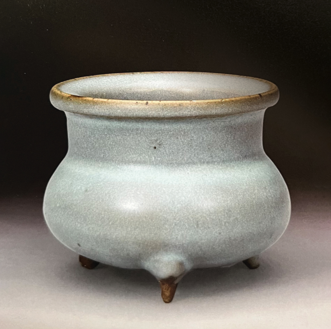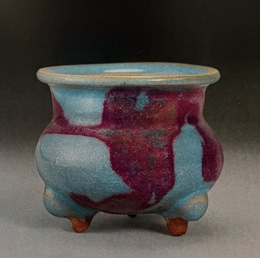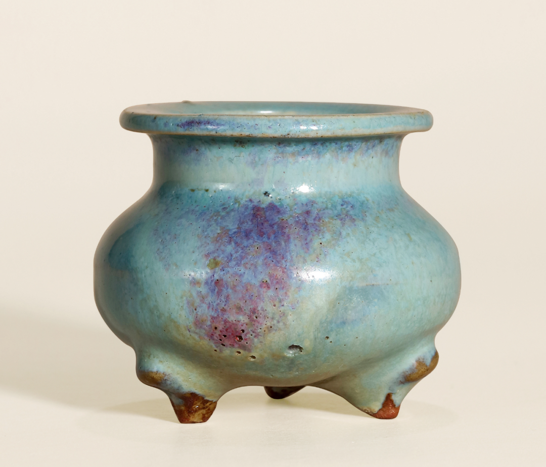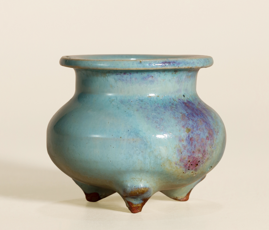 与本品近似者可参考北京故宫博物院收藏的两例,均为金代钧窑天蓝釉三足炉,见《钧瓷雅集——故宫博物院珍藏及出土钧窑瓷器荟萃》第88-91页,图版27、28。又可见一例新安县夹沟窑出十的元钧天蓝釉三足炉,录于《中国陶瓷全集》第10卷,第187页,图版209。见一钧窑紫斑者,可参考Eumorfopoulos旧藏一例,现存伦敦维多利亚与艾伯特博物馆,载于柯玫瑰,《Song Dynasty Ceramics》,伦敦,2004年,图版26。