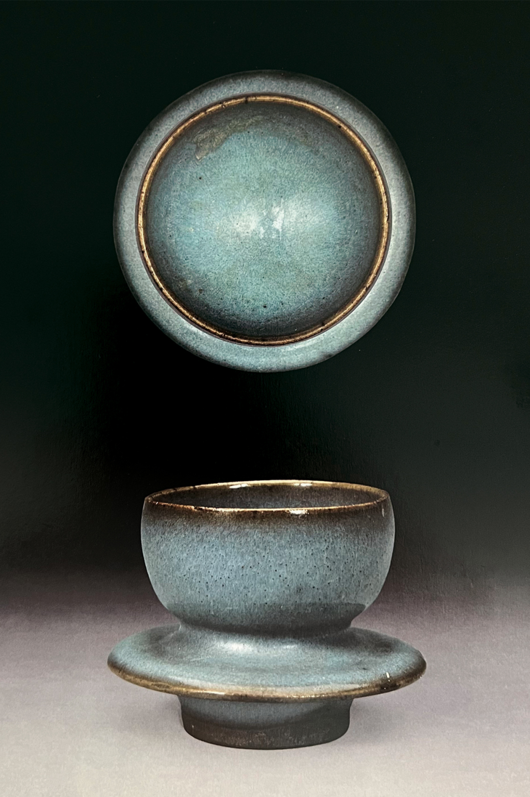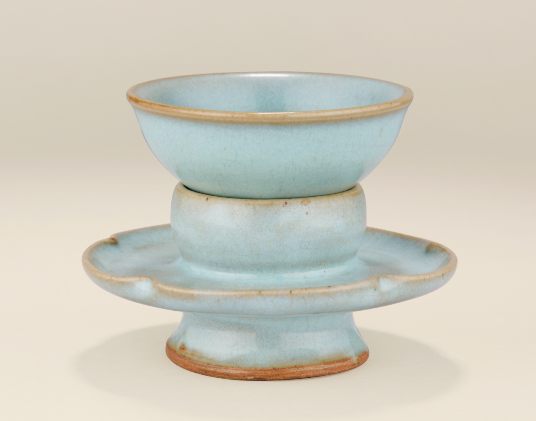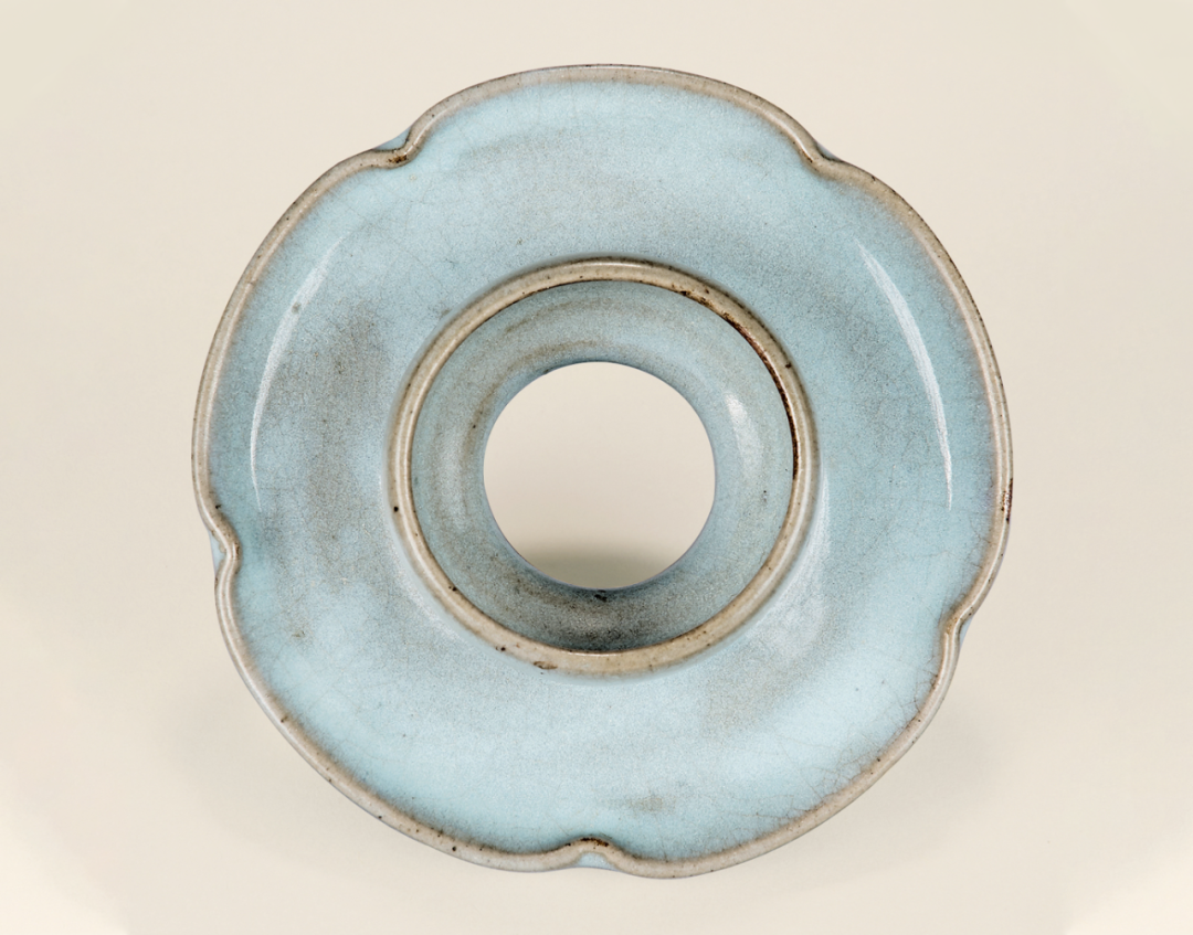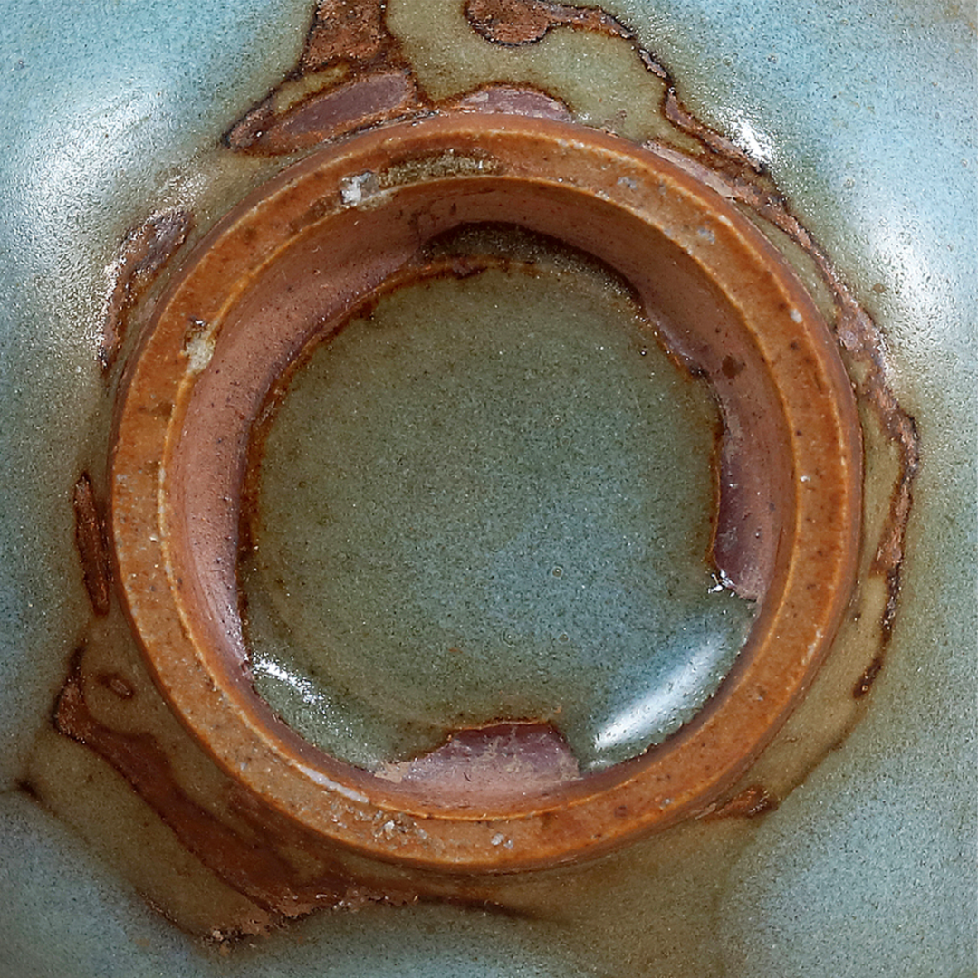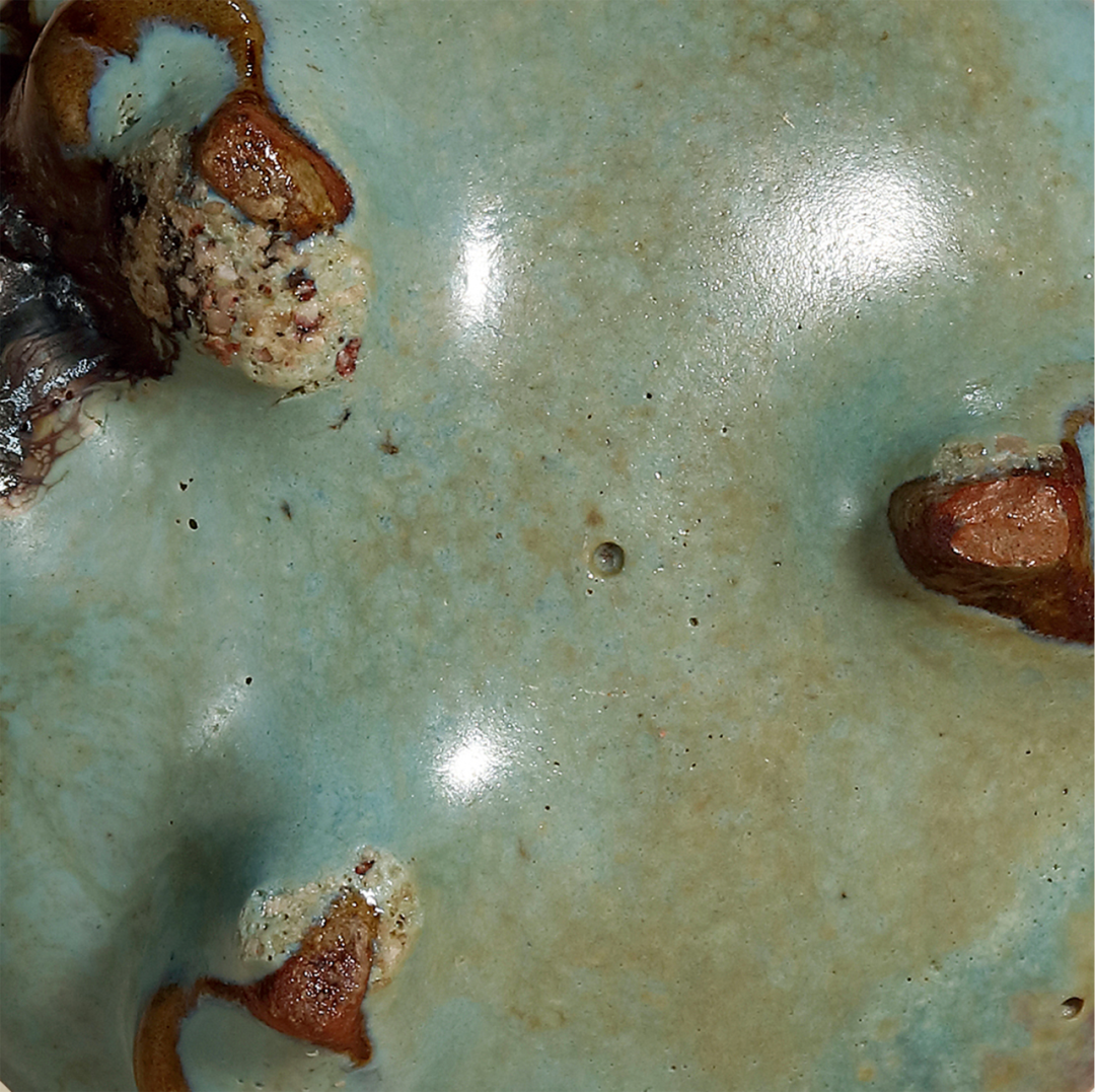 与本品近似者可参考北京故宫博物院收藏的两例,均为金代钧窑天蓝釉三足炉,见《钧瓷雅集——故宫博物院珍藏及出土钧窑瓷器荟萃》第88-91页,图版27、28。又可见一例新安县夹沟窑出十的元钧天蓝釉三足炉,录于《中国陶瓷全集》第10卷,第187页,图版209。见一钧窑紫斑者,可参考Eumorfopoulos旧藏一例,现存伦敦维多利亚与艾伯特博物馆,载于柯玫瑰,《Song Dynasty Ceramics》,伦敦,2004年,图版26。