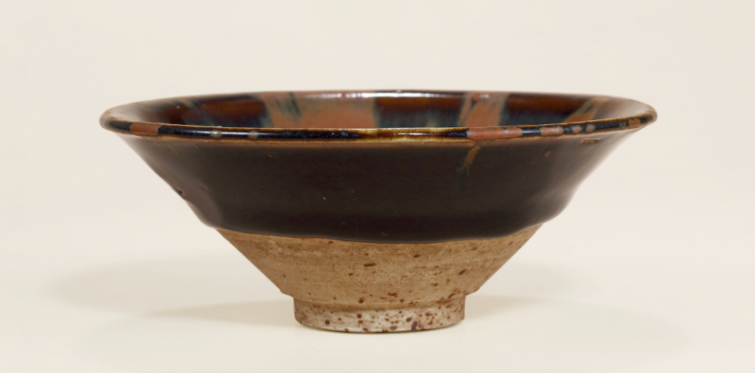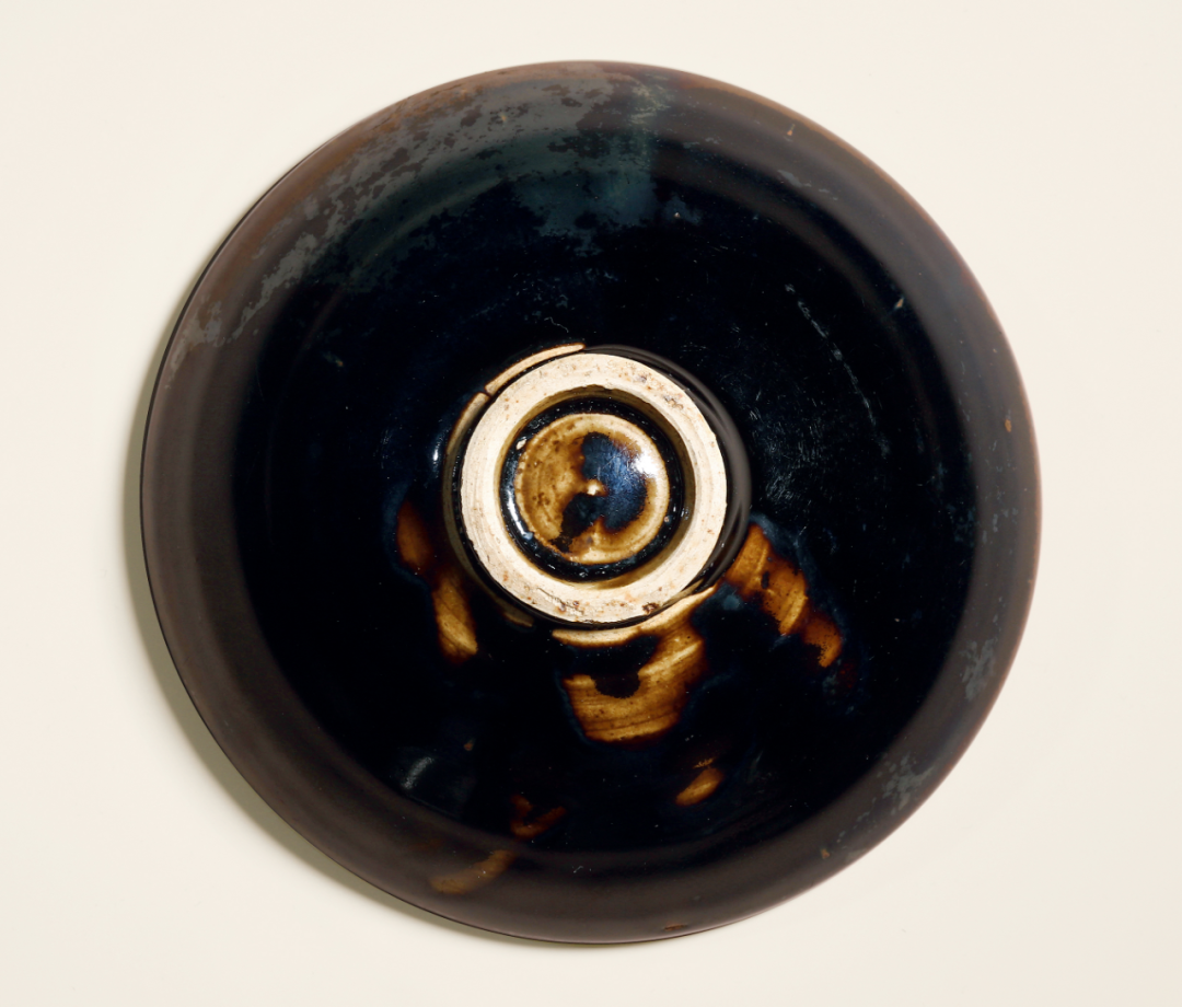此碗胎体厚重质朴,敞口微撇,弧腹深斗,底承圈足,足胎白褐,饰以黑釉,盏内外壁皆有铁锈斑,整器造型浑厚大气。釉面色泽变化万千,在黑釉上再施一层褐釉而成,其区别在于含铁量的不同,施面釉采用洒釉的手法,使之形成形状各异的斑纹。在高温烧造过程中,施上去的釉因为流淌、互相渗透而产生千变万化的纹饰,产生互相交融流淌的效果。给人以无限的想象,深化了自然天成的审美情趣,充分表现出景有限而意无穷的韵味。
