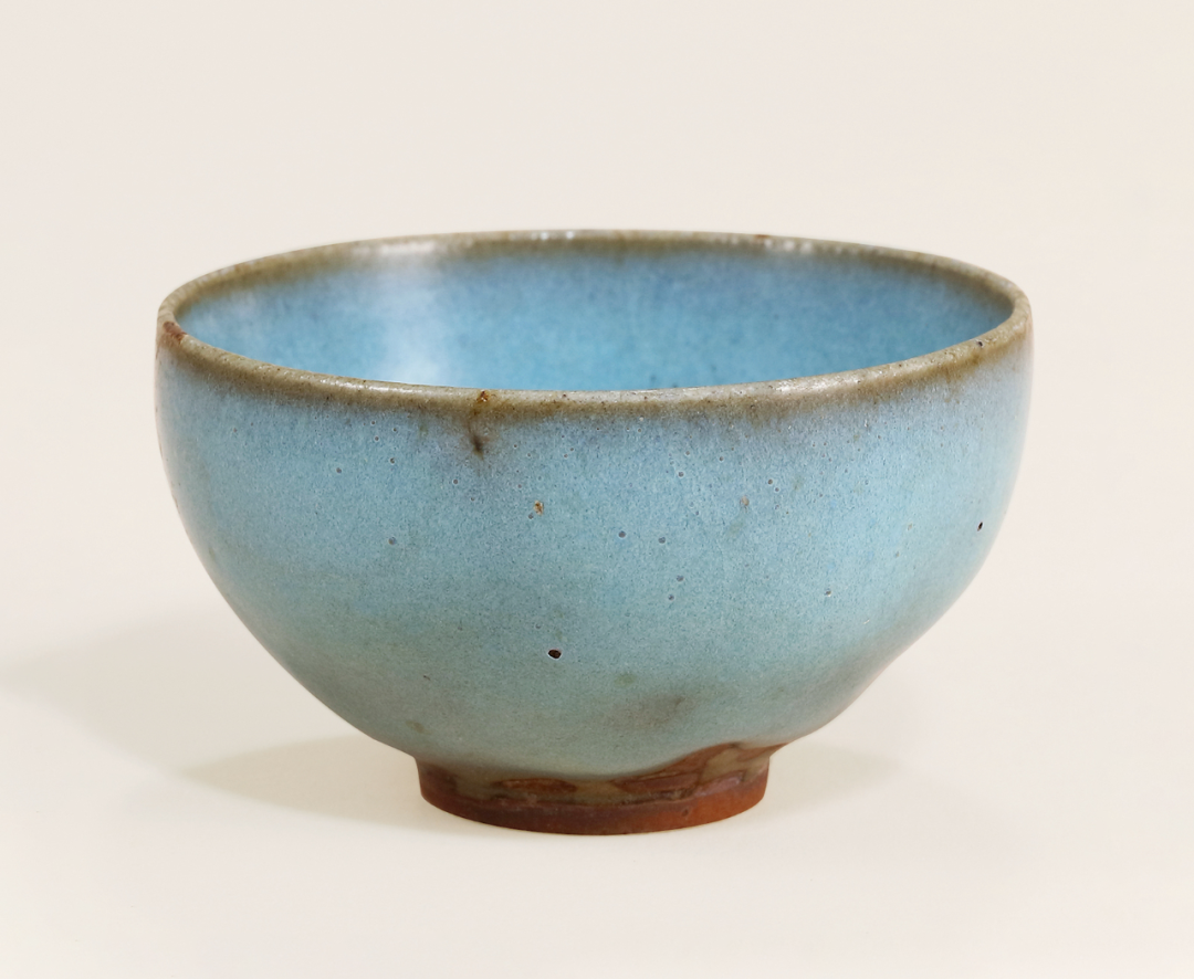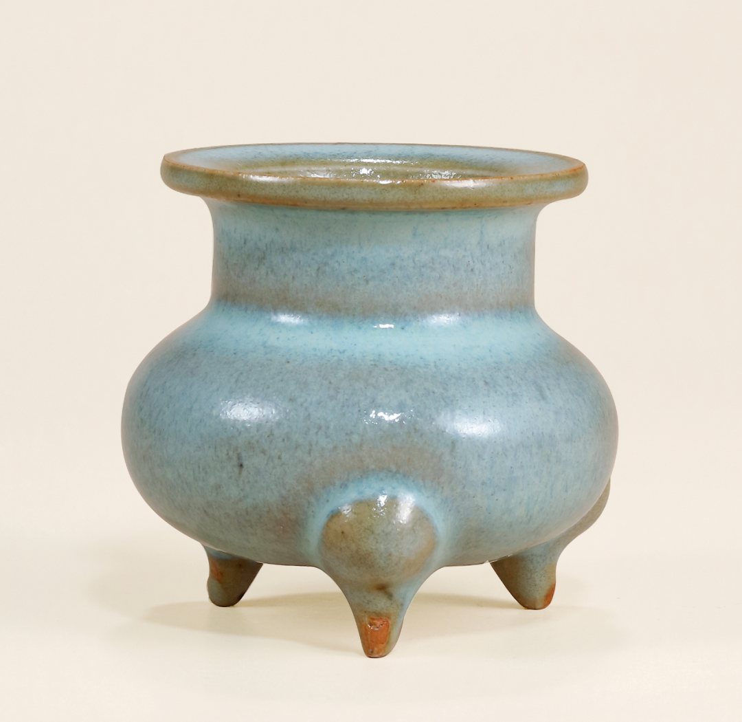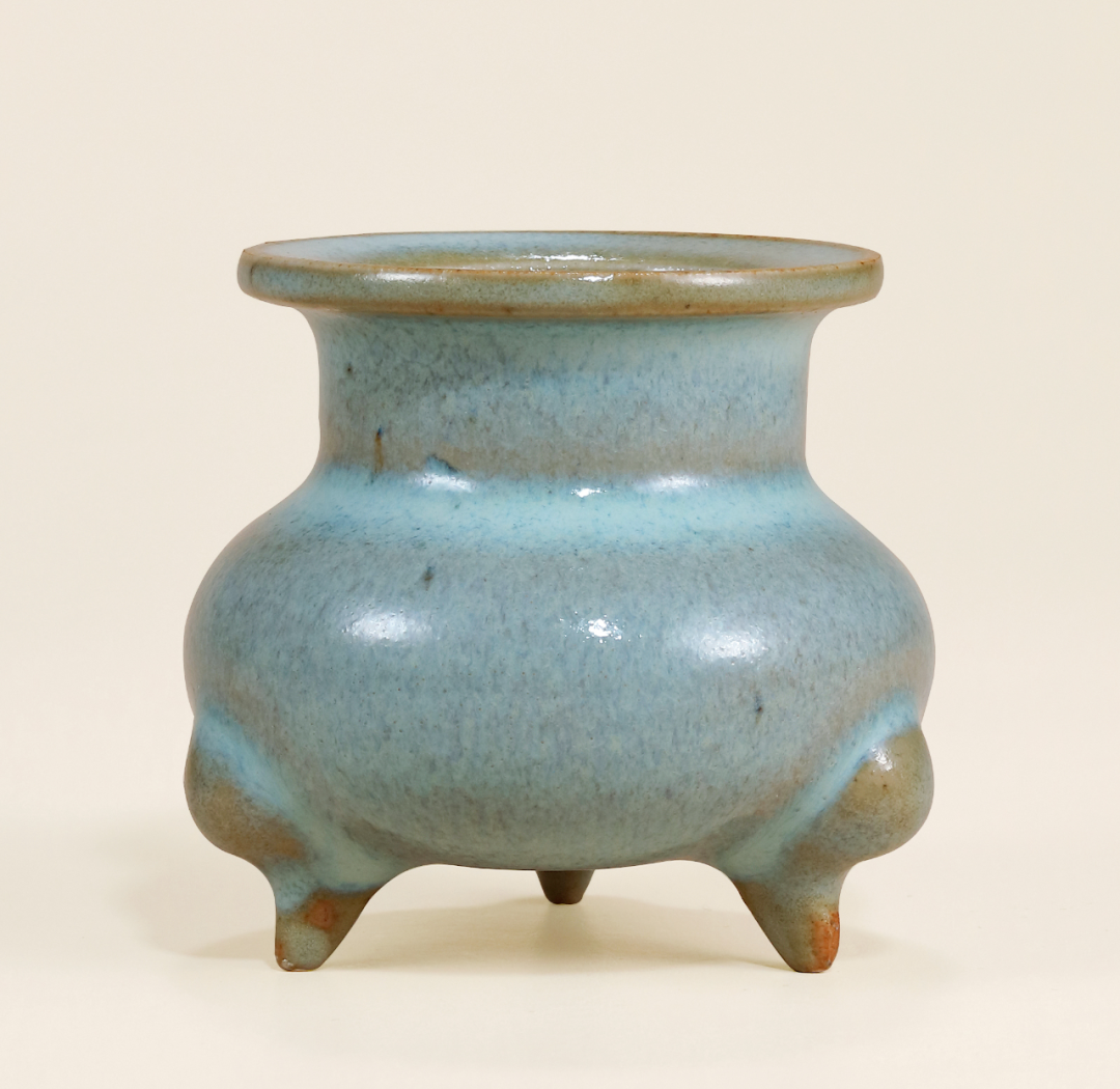 天蓝釉三足炉,唇口,直颈,溜肩,鼓腹,下承三足。通体施天蓝釉,釉的变化相互交融,釉层肥厚丰腴。其口沿处挂釉较薄,在胎骨衬托下呈酱色。整体施釉至炉底,三足无釉,足底露胎。一般此类炉器身多见模造纹饰,釉色带斑,风格较为繁复。而本品炉身素净,更显钧釉之华,简约秀丽,韵味悠长。