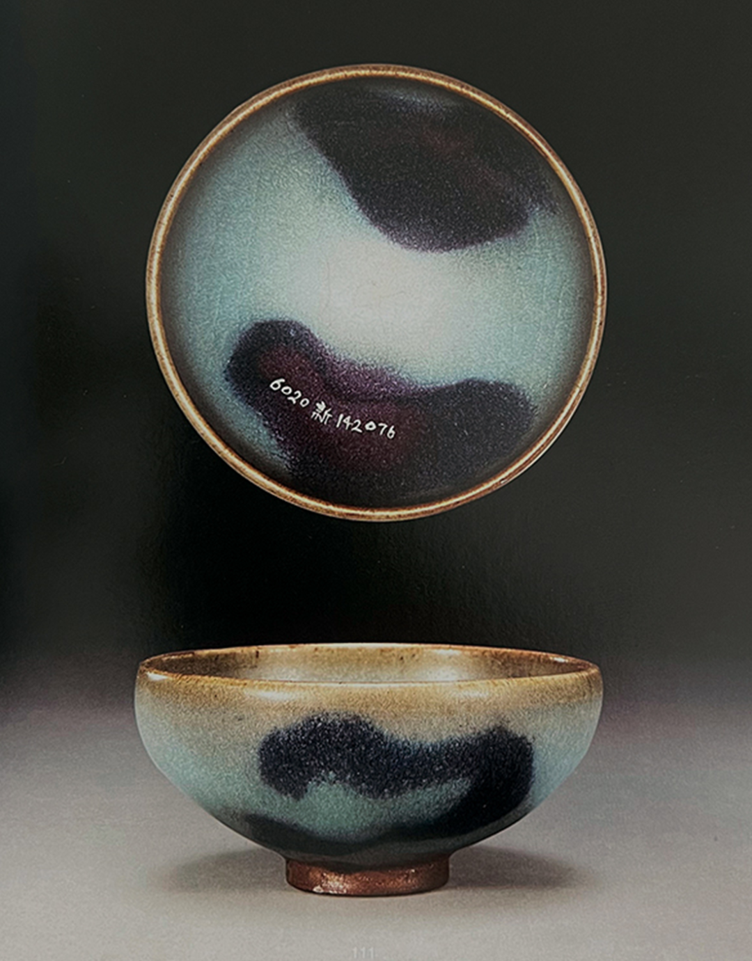 释文:“钧州窑自以一道釉为古雅,青若葱翠色,尤为难得,亦属火性变化,窑变之器也。唐宋尚青,明清尚红,自为独有心领神会之境界。斯则观赏钧瓷之独特乐趣也。濠园居士鉴古。”