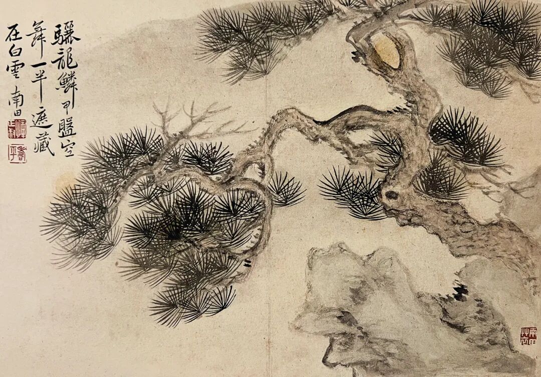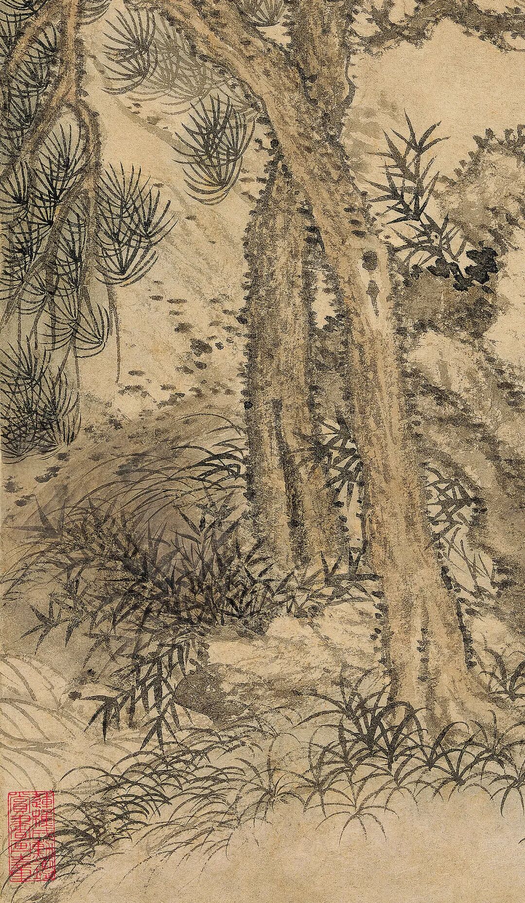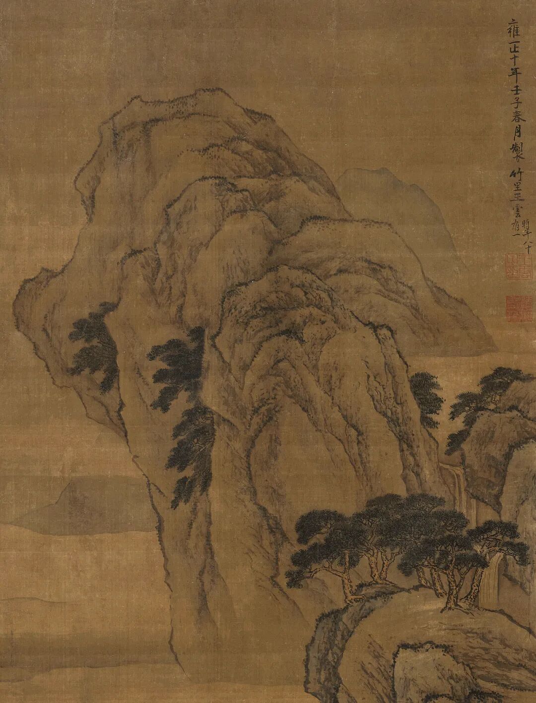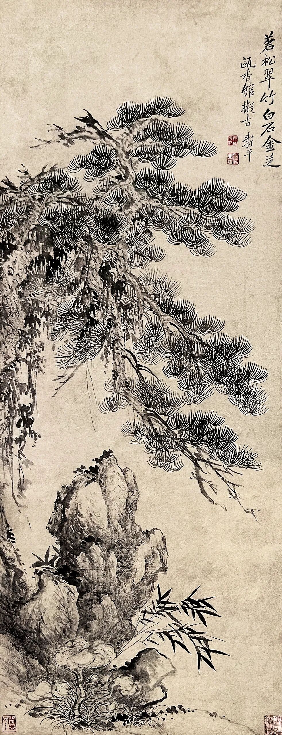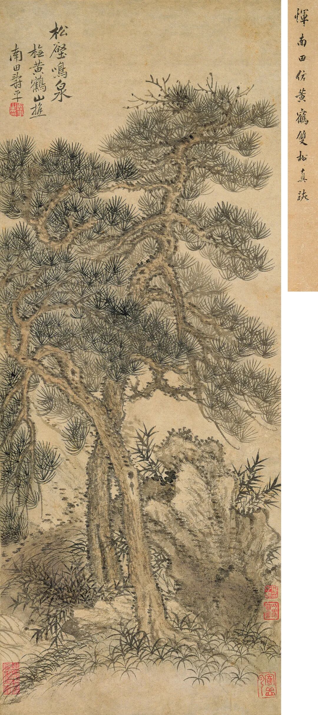 2.成勋,清代鉴藏家,很多宋元法书之上即有其鉴藏印,如北宋王升《首夏帖》、傅尧俞《蒸燠帖》、刘岑 《门下帖》、乔行简《闰余帖》,南宋辛弃疾《去国帖》等。3.夏一驹,字昂千,号一斋,又号凤凰山樵,江苏江阴人。精鉴赏,富收藏,能刻印。辑所藏之印为《拾古印遗》,并撰《古印考略》一卷。4.陈宝琛(1848-1935),字伯潜,一字伯泉,号弢庵、陶庵,福建闽侯人。同治七年(1868)进士,授编修。历官江西学政、内阁学士、山西巡抚等,宣统帝(溥仪)师傅、弼徳院顾问大臣。工书法,学黄庭坚,又擅画松。张庚的《图画精意识》著录了王蒙所作《松壑鸣泉图》,并评述曰:“松石山涧用笔皆本色,忽以高彦敬法作一小峰衬于中,通幅更觉灵动。今之仿黄鹤者不知也。”,指出了《松壑鸣泉图》与寻常之作不同的妙处。《瓯香馆集》卷七记载了恽寿平题跋王翚为庄冋生所作《仿王叔明松壑鸣泉图》,序文述说原委,并题诗:“松风吹雨过幽篁,石濑鸣泉涧路长。尽日横琴茅阁冷,堡石深处话羲皇”。是图虽为卷,但从中亦可想见恽寿平对王蒙《松壑鸣泉》的感知。恽寿平画作中多有仿王蒙法作山水,其中约于40岁之前,其点景山水所作之松多以王蒙画松法为之,松针多横向排布,杂乱且具纹理。而后所作松树之松针逐渐条理清晰,成规则分布,可参见1671年所作天津博物馆所藏《双松三秀图》;之后,约1681年所作故宫博物院所藏《松石丛篁图》之松针成组,且呈扇形排布明显,挺拔多直线;类似的还见于广州艺术博物院所藏恽寿平《花卉册》之画松一页以及沈阳故宫博物院藏约1685年作《溪馆连松图》、常州博物馆藏恽寿平《苍松翠竹图》。本作《松壑鸣泉图》言“摹黄鹤山樵”,其主体为松,且松树画法多为己出,其风格与故宫博物院所藏《松石丛篁图》画法近似。《松石丛篁图》题句中有“徒倚白云外,盘桓陶径深”是谓学陶渊明《归去来辞》之旨,而本作《松壑鸣泉图》应有相同意趣,抚松而听泉,“无我之境”或者更能体现恽寿平的“白云外史”心境。![]()