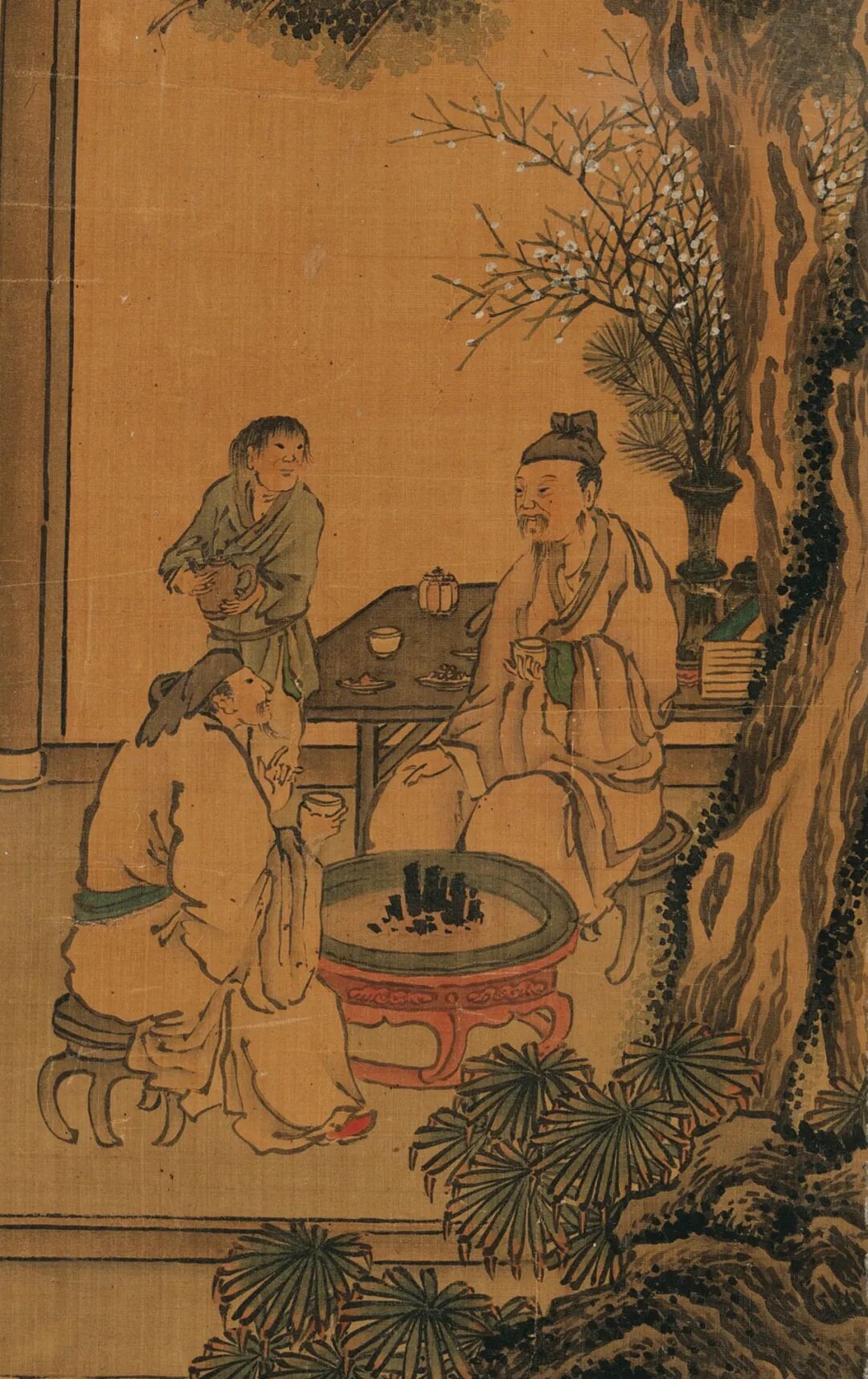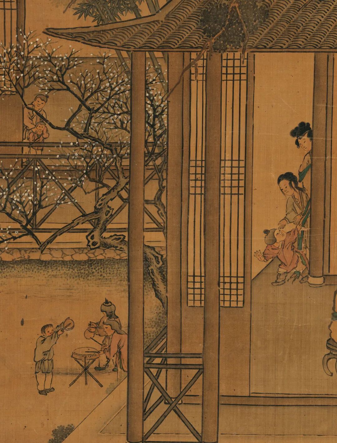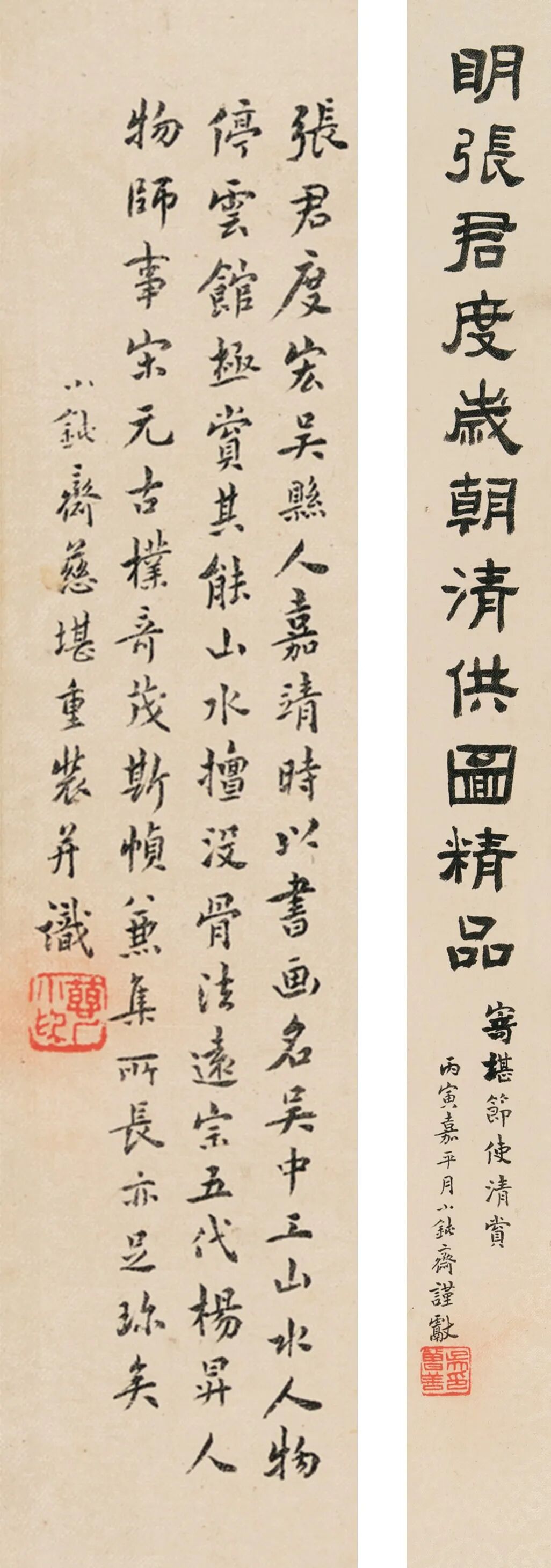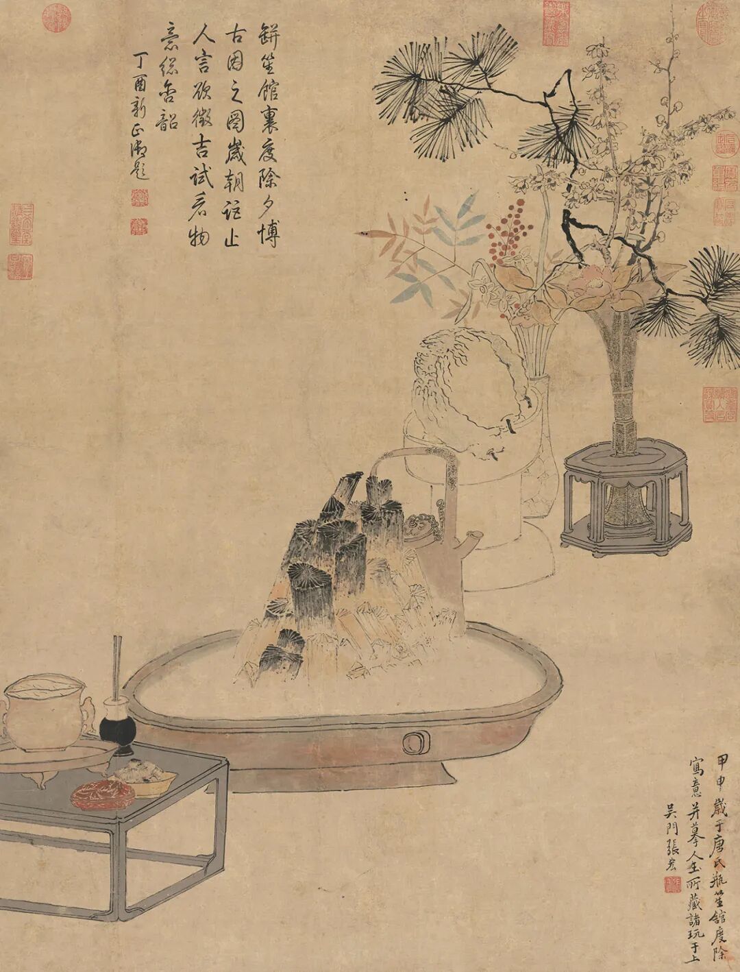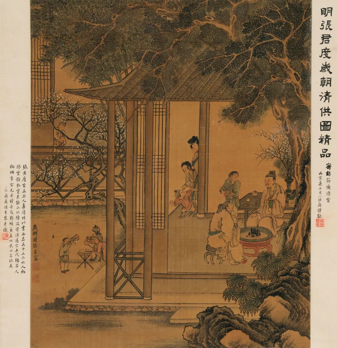 铃木敬编《中国绘画总合图录》第二卷,S1-04,东京大学出版会,1982年。《海外所在中国绘画目录》,第3页,东京大学出版社,1981年。1.台湾后真赏斋旧藏。后真赏斋乃台北华淑和与其兄之收藏,因二人为明代无锡华夏真赏斋之后人,故采此名。2.裱边有吴曾善(1890-1966)双题,“寄堪节使”或为李遂贤。李遂贤,晚清民国吴县(今江苏苏州) 人,原籍上元(今江苏南京)。字仲都,一字仲子,号寄堪、吟香居士、吟香馆主人等。清光绪二十五年(1899年)诸生。曾肄业于苏州、温州、杭州等地书院。三十四年肄业于浙江法政学堂。1912-1935年供职于京绥、京汉、中东铁路局及交通部,曾任文案、课长、科长、商务委员,其间曾任交通部审订铁路法规会会员、交通史协修,哈尔滨法政大学经学讲师。喜治金石篆籀之学,尤嗜篆刻。擅画山水及工笔花鸟,长于写真。工诗文词曲,精通音律。早年与洪炳文订盟,曾为其绘《适园记》图,洪炳文戏曲作品大都由其正谱。所著杂剧《罗阳秋忆》与洪炳文《信香秋梦》合订为《瓯江酬唱集》。另作有传奇《青衫怨》。著有《十三经说义》《客梦留痕集》等。3.吴曾善(1890-1966),字慈堪,号小钝。江苏元和人。近代书法家。吴郁生侄子,书法得吴郁生薪传,风格极似。早年毕业于上海法政学堂,先后在苏沪两地任司法行政官、律师,曾任吴县律师公会会长,兼任东吴大学法学教授。抗战前夕,沈钧儒、邹韬奋等“七君子”遭国民党逮捕,吴曾善为之辩护。抗战爆发前夕曾任苏州抗日后援会会长。苏州沦陷期间迁居上海,以卖字画(与丰子恺、吴湖帆、张继馨等合作)维持生计。1954年任上海市文史馆馆员,从事古籍整理文字改革工作。“岁朝”一词最早见于《后汉书·周磐传》“岁朝会集诸生,讲论终日”,唐代章怀太子李贤注曰:“岁朝,岁旦。”即一岁之始。自汉武帝以后,“岁朝”均指农历正月初一。而“岁朝图”,顾名思义就是为了庆贺“岁朝”的节令画。传世最早的岁朝图应是北宋赵昌所作的《岁朝图》,据说宋徽宗(1100-1126年在位)每逢春节将临,即命其图画院的画师们描画冬季不能见到的花卉禽鸟,陈列宫中,以增添岁朝的喜庆气氛。此后,“岁朝图”的内容逐渐扩展,经明、清而至近现代,大至文房器物,小至灯笼、鞭炮、果蔬等日常生活用品,都成为图上的吉祥物,成为老少皆宜雅俗共赏的题材。张宏(1577-1652)字君度,号鹤涧,吴县(今江苏苏州)人。善画山水,重视写生,笔力峭拔、墨色湿润、层峦叠嶂、秋壑深邃、有元人古意。他的山水画以石面皴染结合为特色,他主要宗法沈周、文徵明,并上追元四家和米芾、董源、巨然,又兼学北宋李、郭和南宋李、夏融合而成自身风格。平生喜好游历名山大川,注重外师造化,汲取绘画养分,藉以开拓创作视野和体悟艺术真谛。所作人物画,线条疏朗,形神俱佳,散聚得宜,皆具天然逸趣。既是一位出色的文人画家,同时又具备职业画家的高超画技与敬业精神,“吴中学者尊崇之”,成为明末吴门画坛的中坚人物。著名艺术史学者高居翰的《气势撼人:十七世纪中国绘画中的自然与风格》一书,第一章专门讨论“张宏与具象山水之极限”,认为张宏“能够摆脱层层传统的束缚,追求一种自然主义式的描绘”,开创了明代绘画自然主义新画风。“张宏在艺术史上的地位,以及他的作品在画评上所受的待遇,这两者的悬殊在如今看来,已是极为明显的了”,称“中国晚明的绘画因后来者无法继张宏的成就而光大之,因此蒙受了损失。”张宏此幅《岁朝图》描绘了阖家团圆欢庆新年的场景。青瓦高堂,二长者举杯闲坐,谈兴正浓。一仆侍立左右,双手捧酒壶,似乎随时准备添酒。中间火盆薪柴正旺,配朱红木架,主人身后桌案上除了书之外,还有插有松柏的青铜花觚等古董文房。院中松竹繁茂,腊梅盛开,三小童正敲锣击鼓庆祝,还有妇人小女携童观望,小童有五位之多,正寓意多子多福,一派欢乐祥和。房屋建筑和人物陈设都有着明显准确的透视关系,画面中山石峻嶒,枝繁密叶,细笔点苔,兼工带写,人物虽寥寥数笔,却刻画生动传神,体现了浓浓的自然主义和现实生活情趣。故宫博物院藏有张宏另一幅《岁朝图》,上题“甲申岁于唐氏瓶笙馆庆除写意并摹人玉所藏诸玩于上。吴门张宏。”画面中亦有火盆壶酒和青铜花觚等物。后侧果盘中盛放佛手,供桌上置炉瓶香具和贡果,全为静物,未置人物,即是庆祝新岁,亦是收藏的展示,可见画家对这一题材的喜爱。