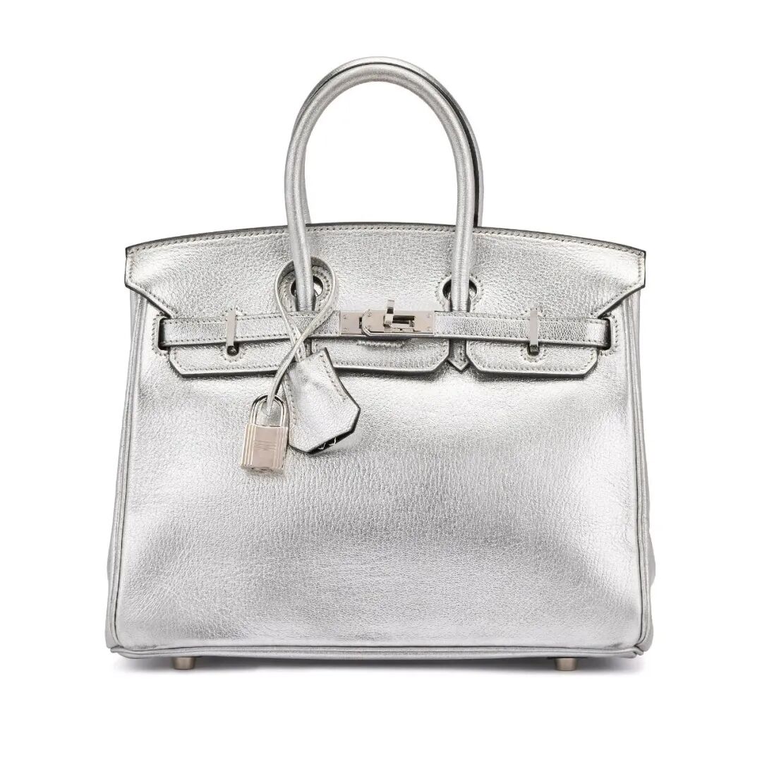 金属色柏金包是2005年爱马仕推出的限量版款式,有银色和古铜两色,底长25公分,属小巧型柏金包。银色柏金包配镀钯金属件,古铜色柏金包则配镀金金属件。它的设计灵感源自莱拉蒙莎里(Lela Menchari)为爱马仕总店布置的橱窗装饰。爱马仕皮革工匠需使用大量染料处理皮革,直至皮革质地改变,才能变为金属色。2021年,一个爱马仕金属银色柏金包在纽约苏富比以126,000美元售出,刷新皮革柏金包在二手市场的成交纪录。