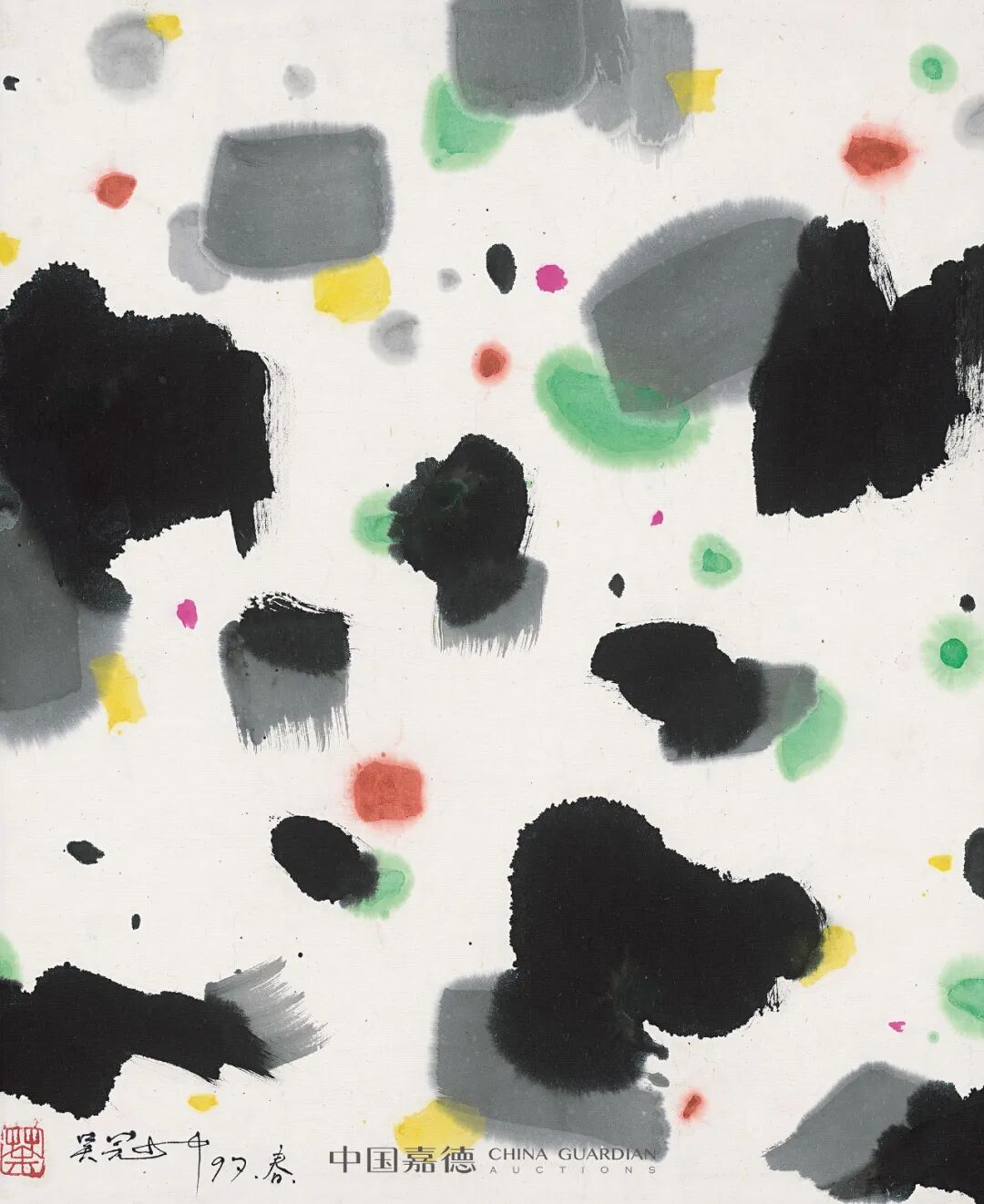 吴冠中先生还有一件作品——《春在》,纸本水墨,嫩红嫩绿的抽象色块,安排在一张近似正方形的纸上,虽然没有具体的形象,但能感觉到春风复归,绿意萌生的气息。