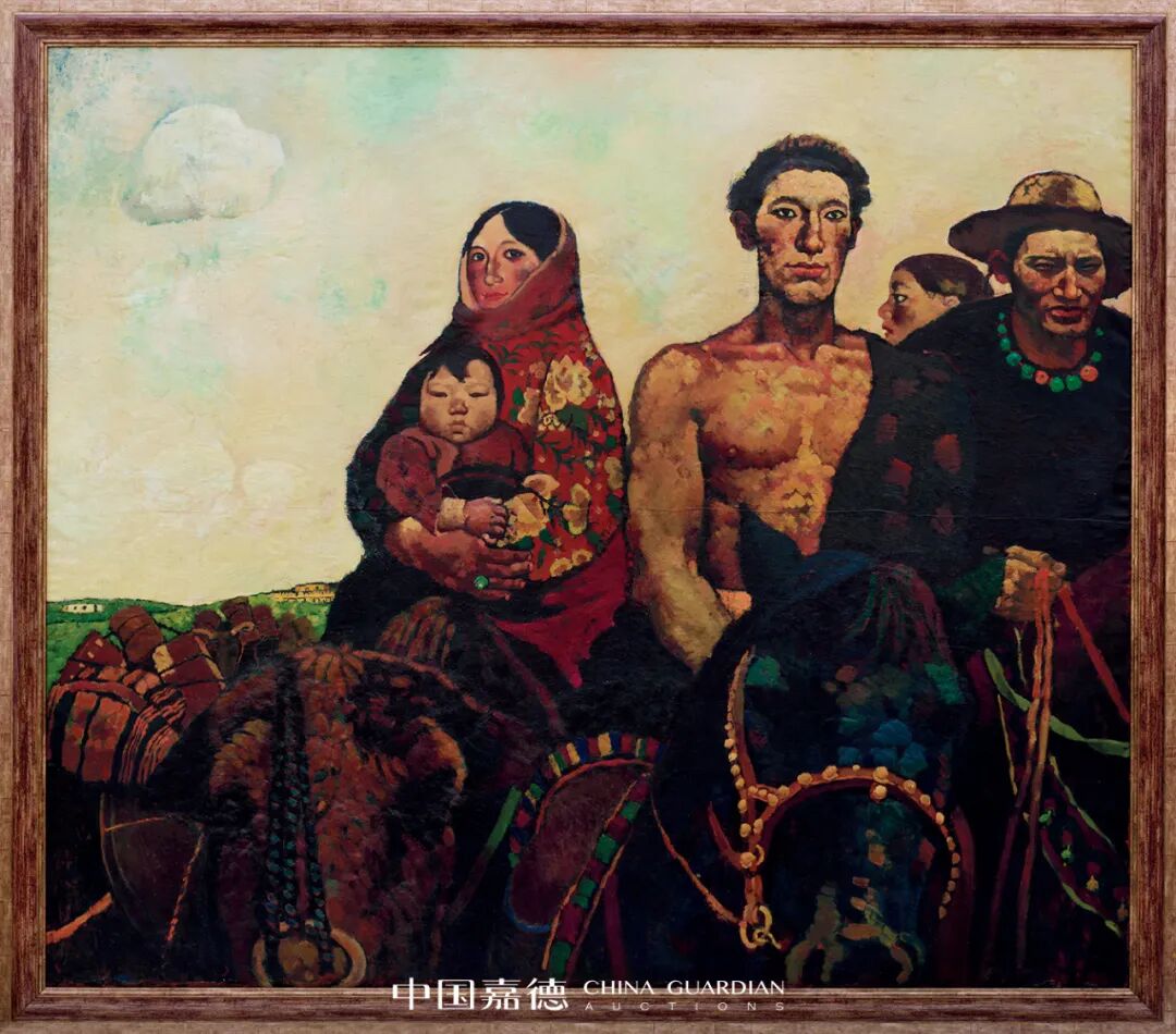 周春芽《春天来了》也是异曲同工,骑马牵牛的一家五口几乎占据了整个画面,好像是在赶路也好像是在迁徙,画面中间一丢丢的绿色暗示着春天的信息,但让人感觉更强烈的是经过一个冬季的等待之后,积攒的一股蠢蠢欲动的力量和希望。