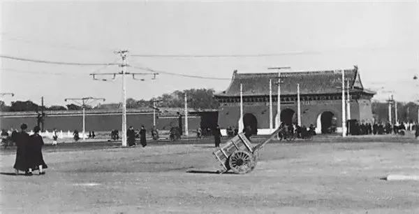 1950年,长安右门南侧,远处的是长安左门。可见电车轨道,长安街上通过天安门前的有轨电车是从长安右门、左门南侧通过。